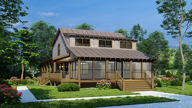 Discover the rustic charm and modern functionality of the Rivers Edge Riverbend House Plan from Nelson Design Group. This thoughtfully designed 1.5-story cabin offers a perfect combination of indoor comfort and outdoor living, ideal for families or as a serene weekend retreat.