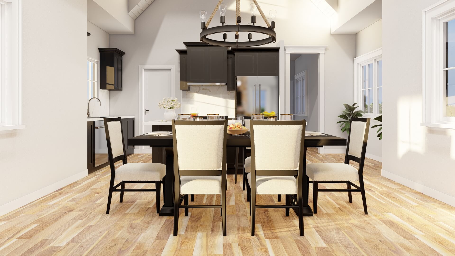- Open-concept kitchen and dining area with eat-at island and walk-in pantry.