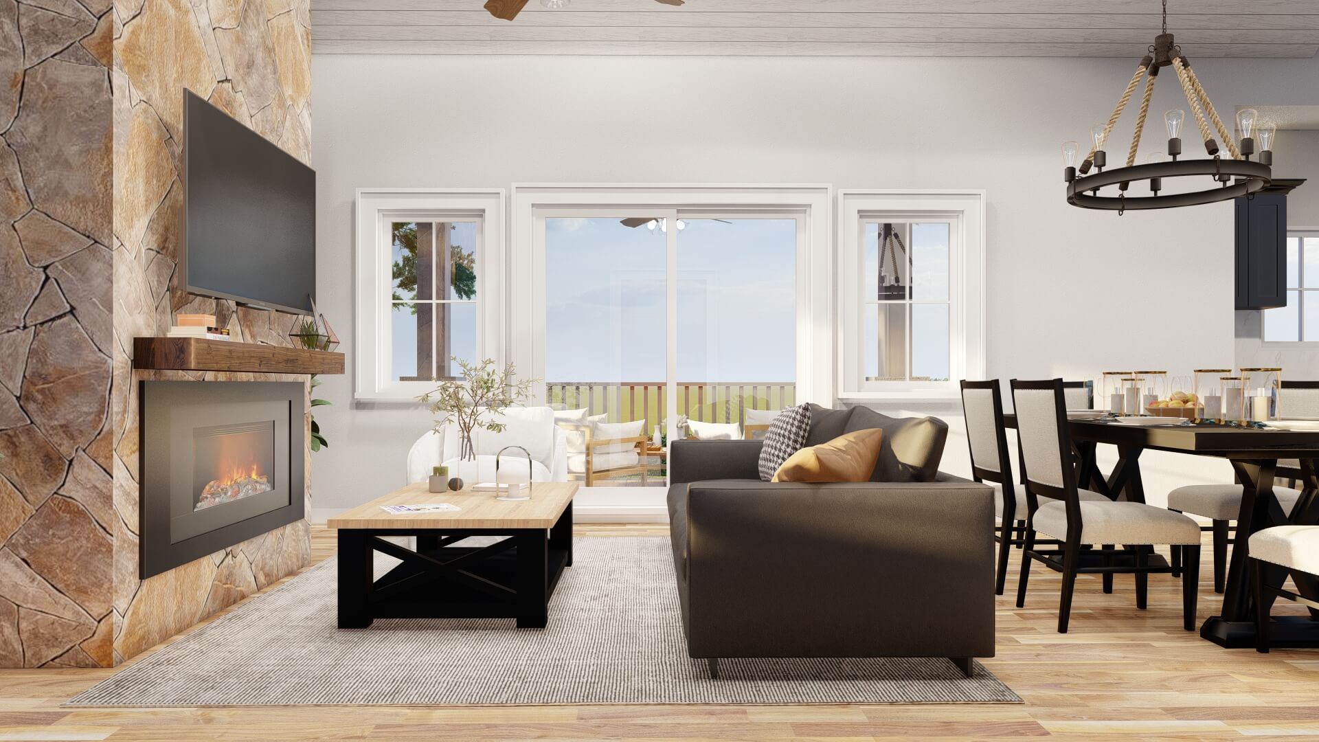 - Vaulted great room with fireplace and abundant natural light.