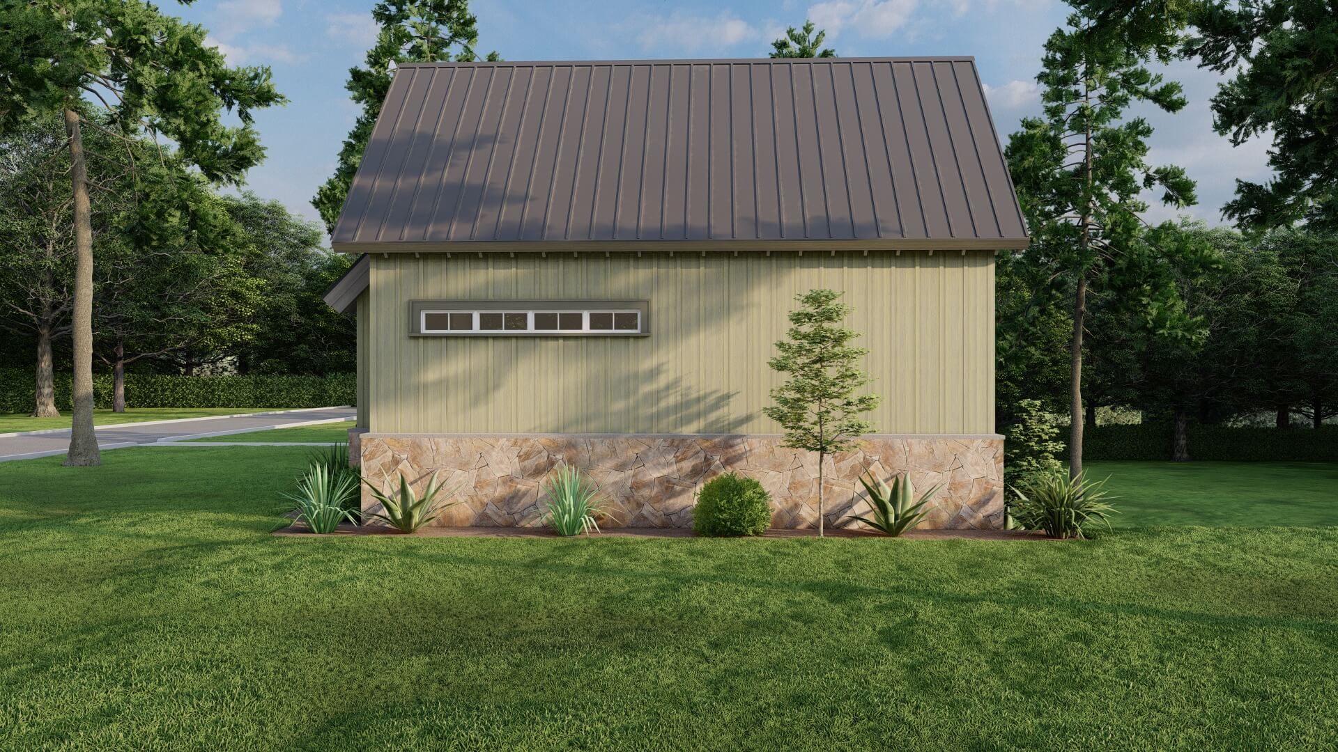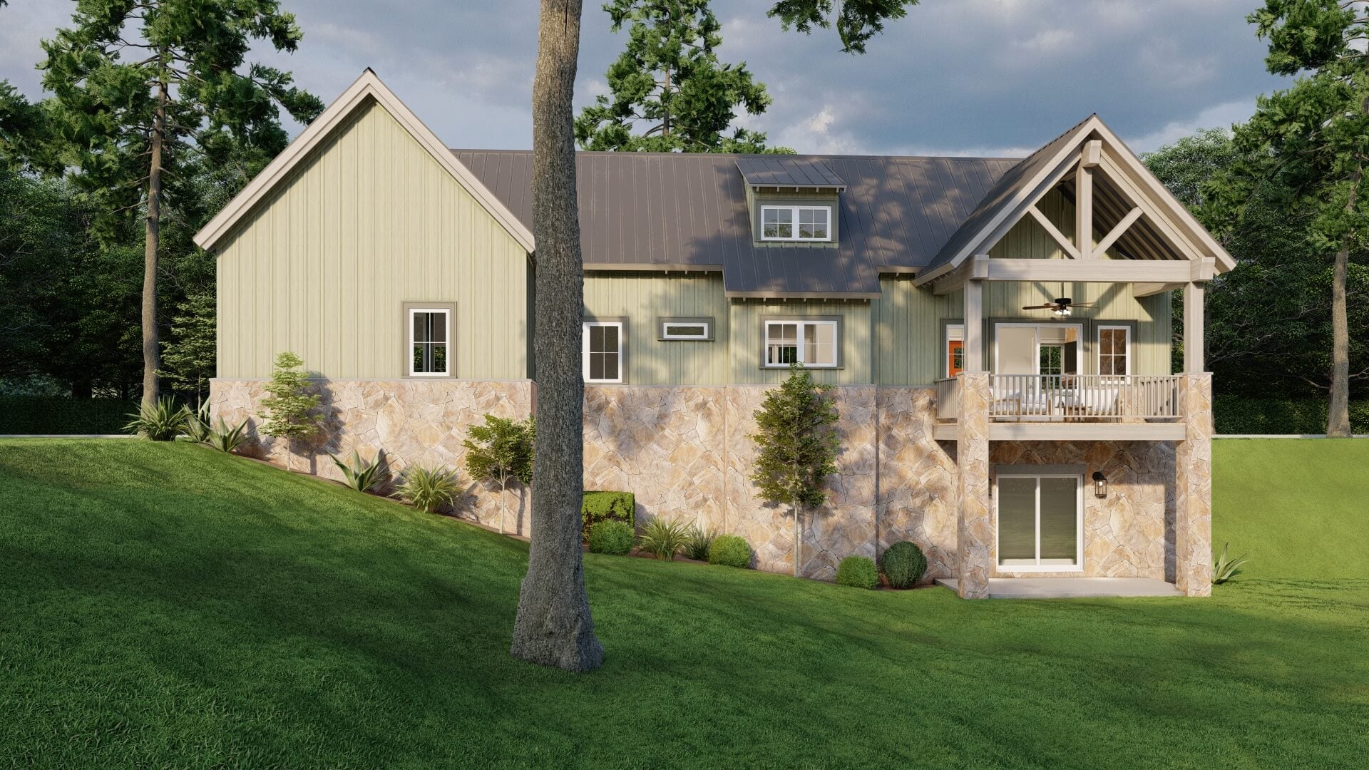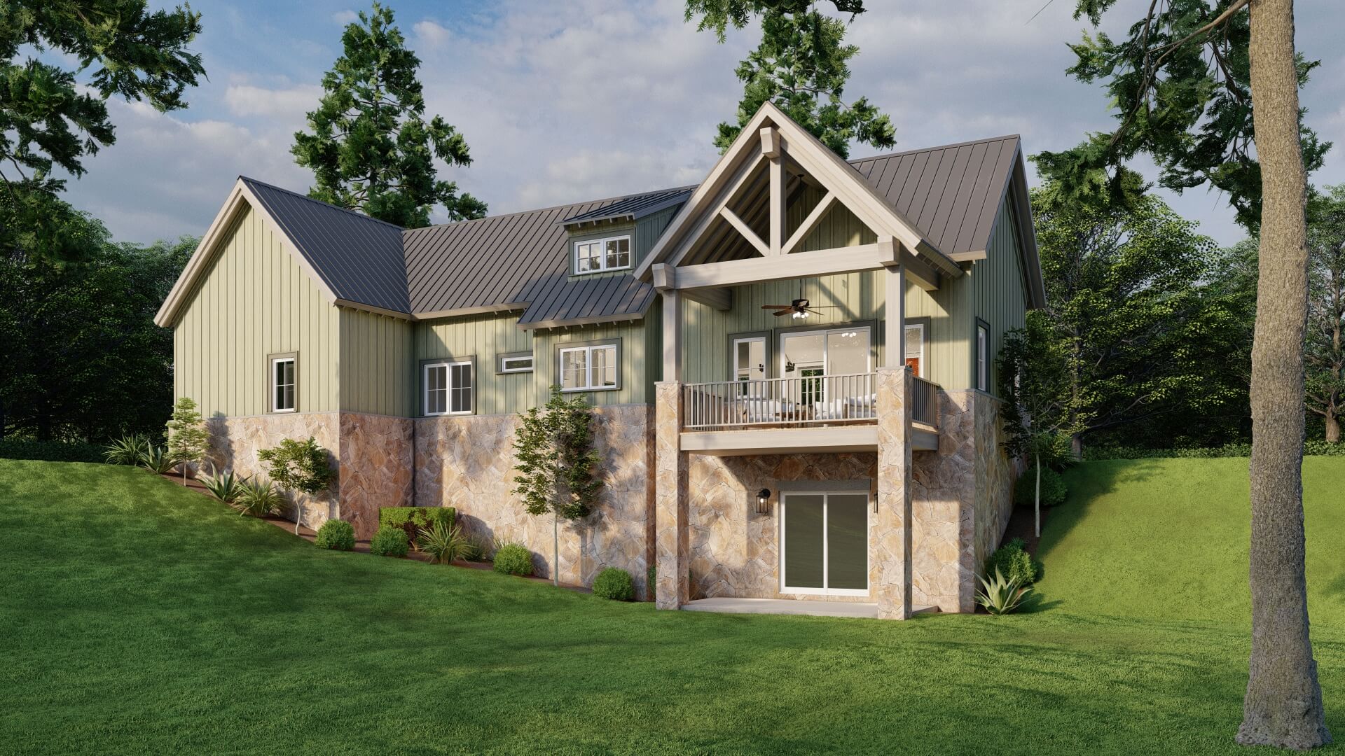 - Rustic-mountain exterior with stone accents and bold roofline.