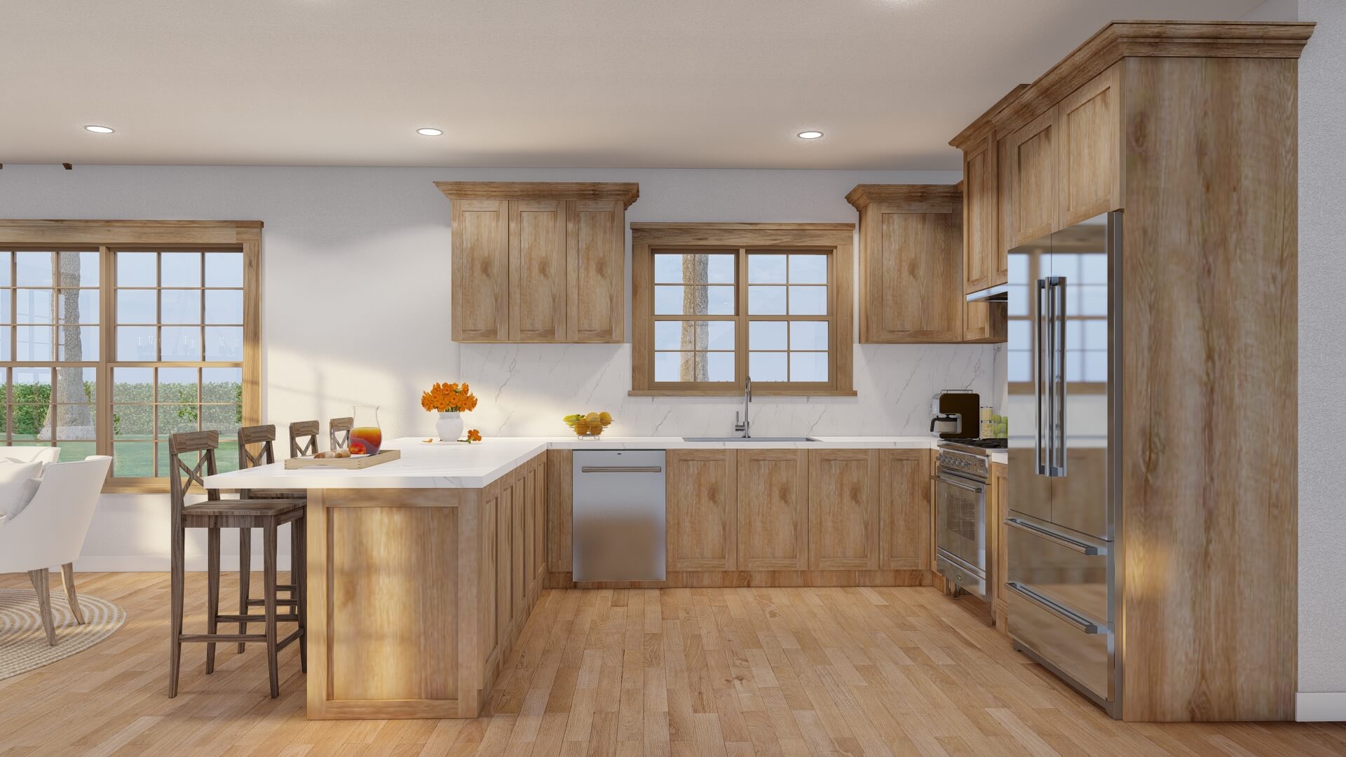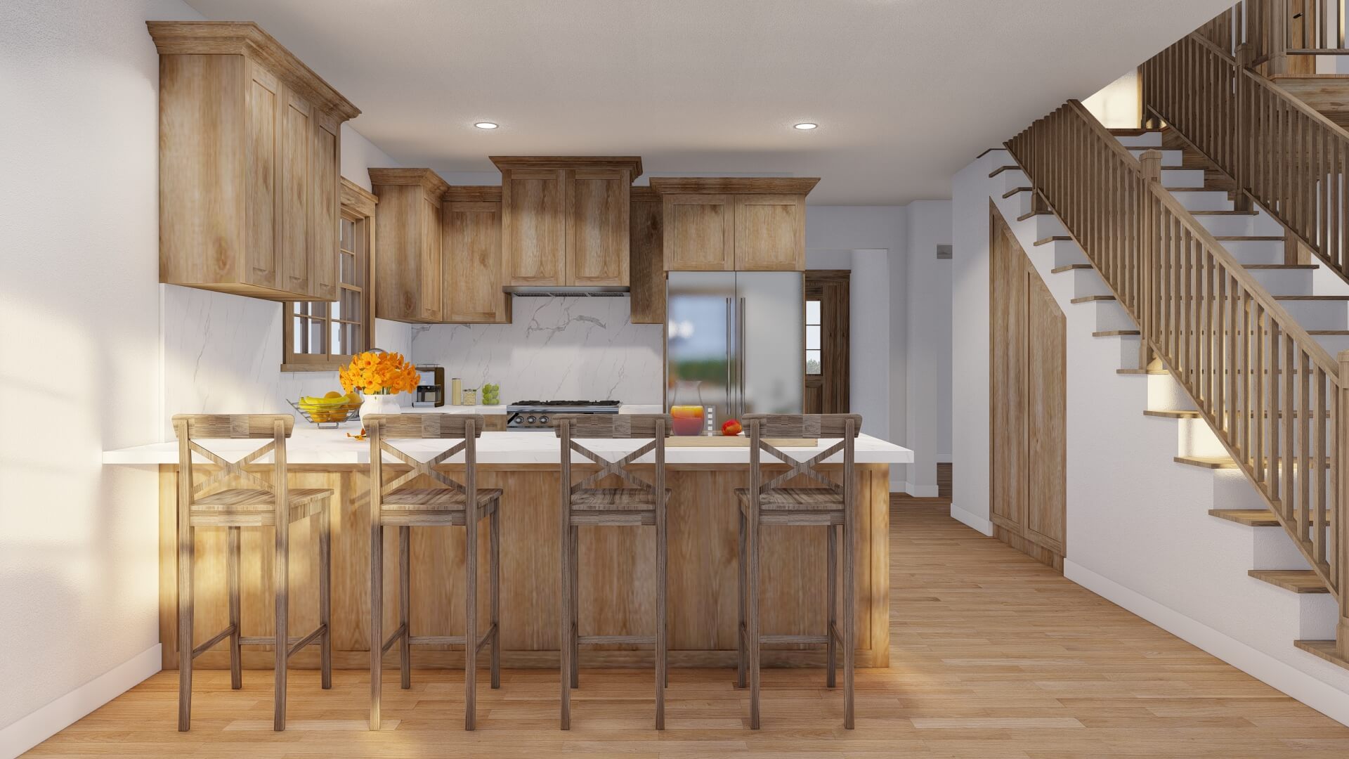 - Generous kitchen with central island, ample counter space, and a walk-in pantry