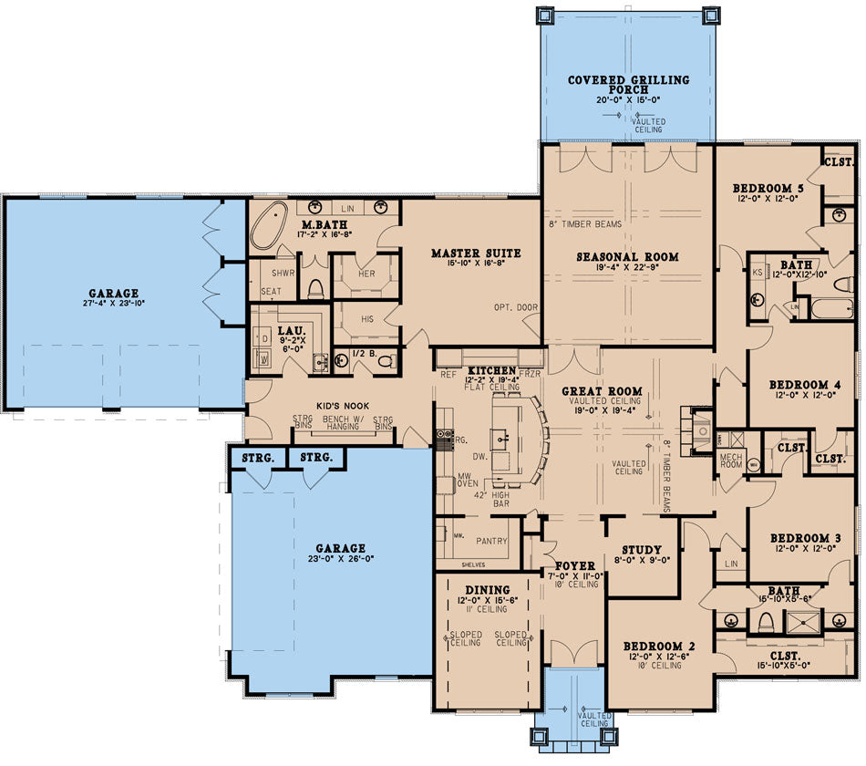 Beyond the indoor areas, the design includes a massive seasonal room and a covered grilling porch—two distinct zones for enjoying the outdoors in comfort. -