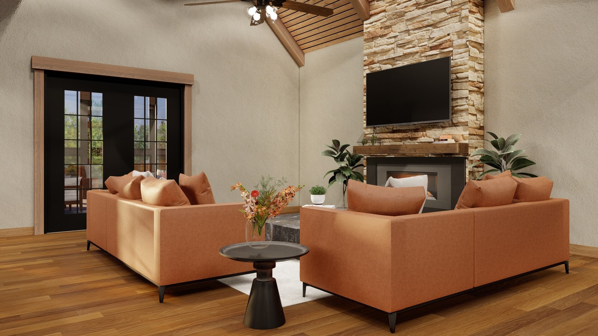 - Open great room with a fireplace, vaulted timber beam ceiling, and seamless flow to kitchen and dining