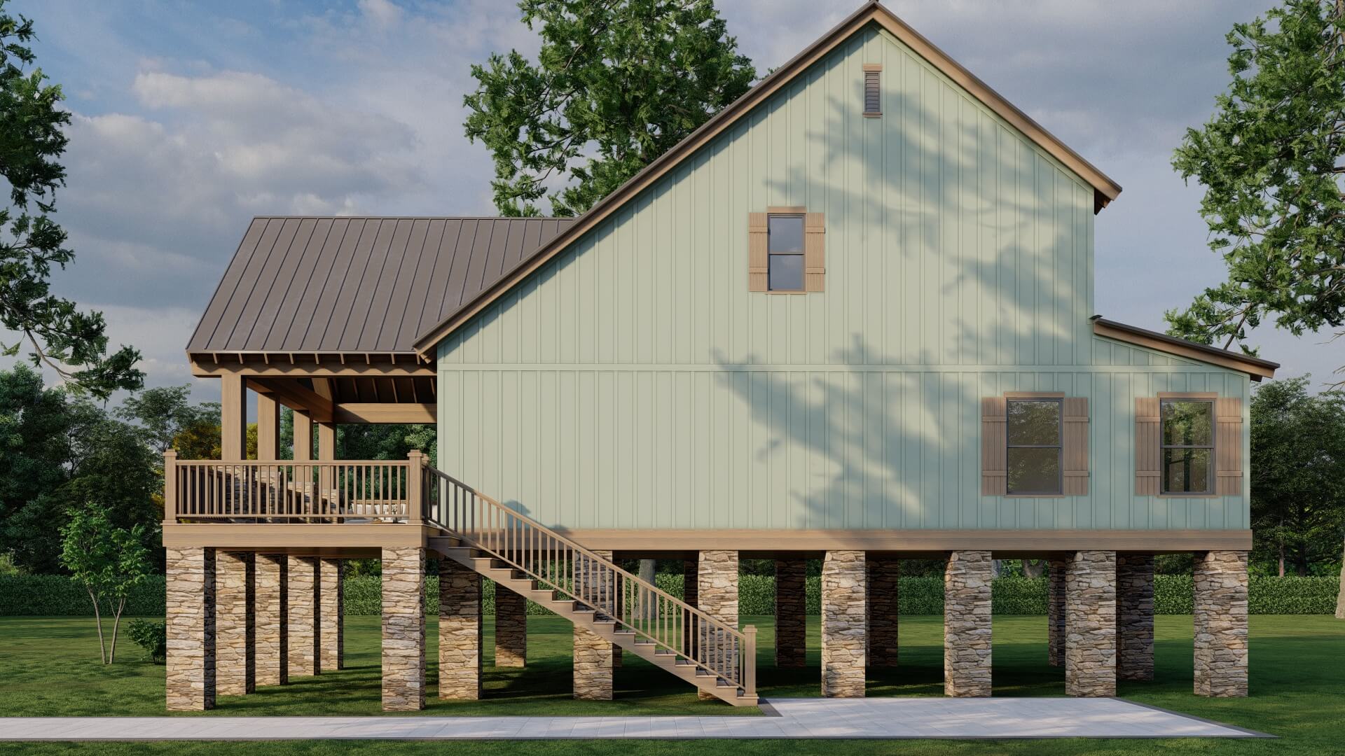- The footprint is 34 ft wide by 54 ft deep, making it well‑suited for wooded lots, lakeside sites, or compact acreage.