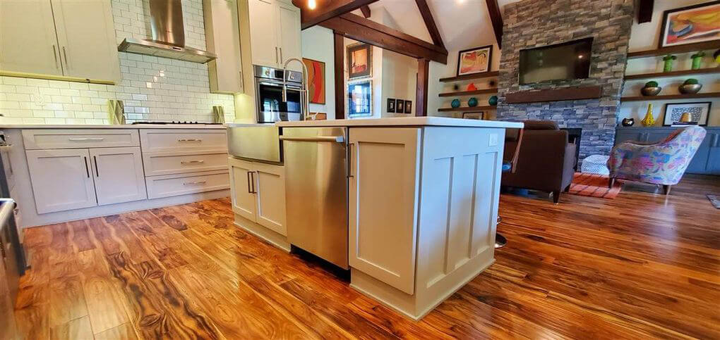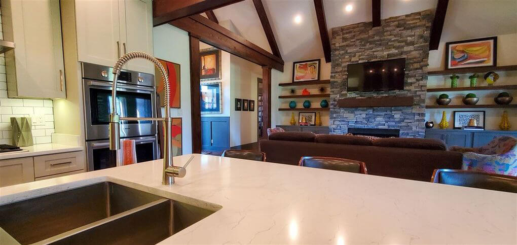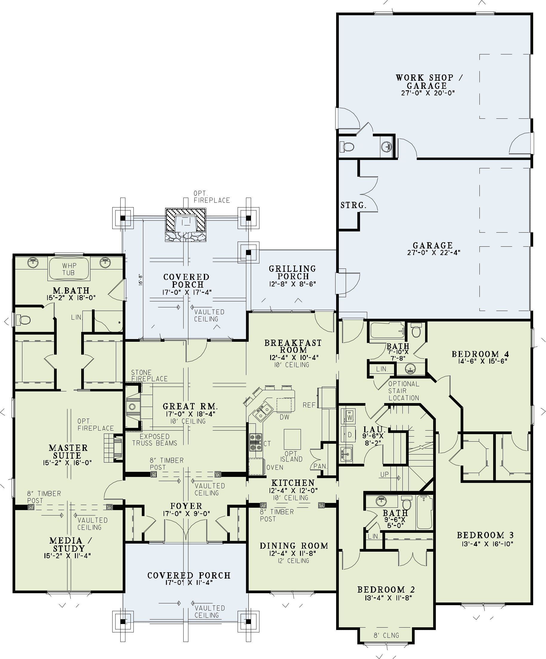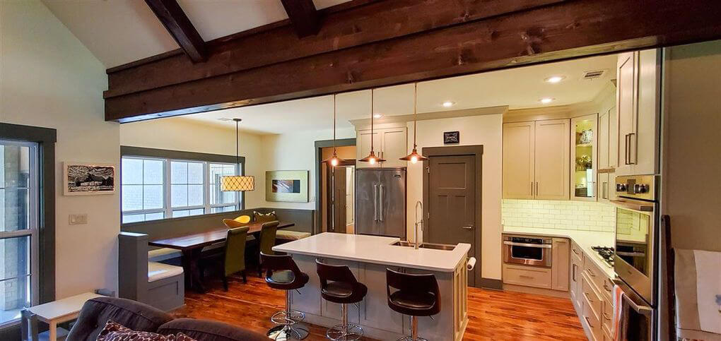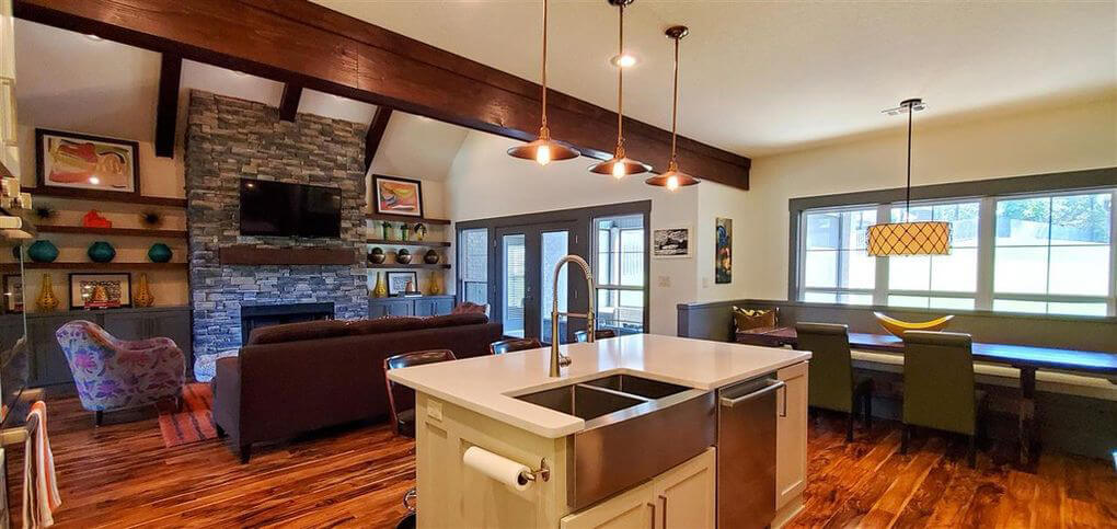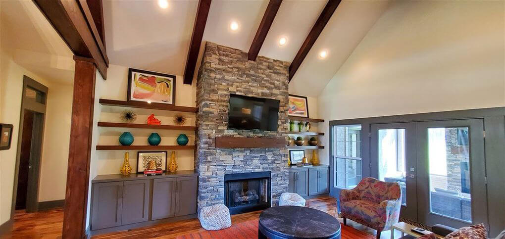 - Great Room: Features a stone fireplace, exposed truss beams, and rustic timber posts.