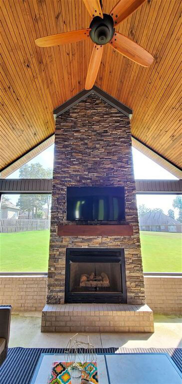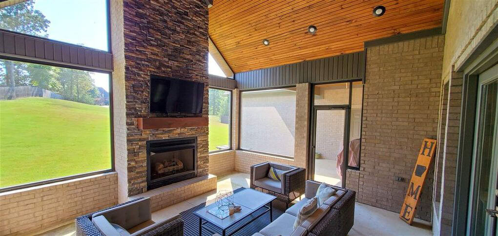 - Outdoor Living: Covered rear porch with vaulted ceiling and stone fireplace.