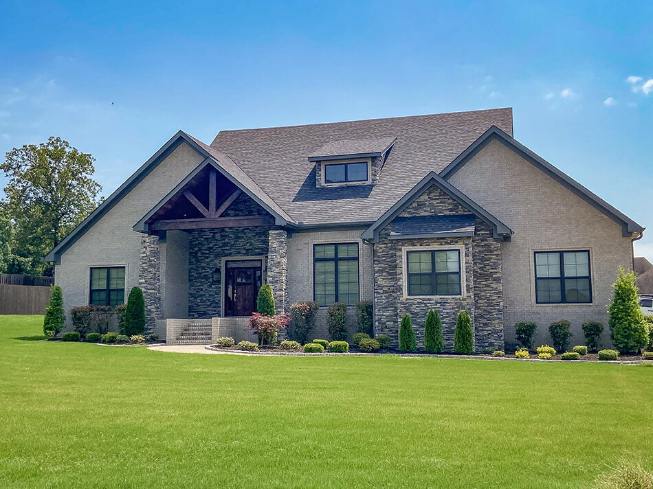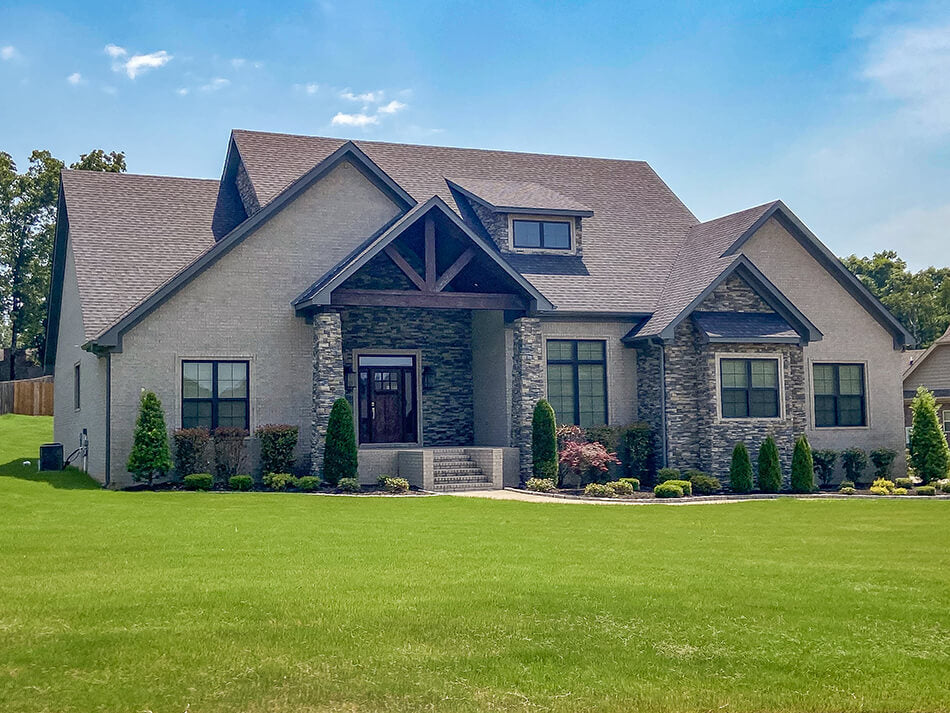 - Grand Entry: Tall stone pillars and rustic timber trusses welcome you into a vaulted front porch.