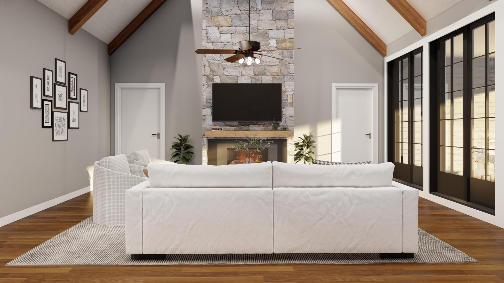 From the inviting covered front porch framed by Craftsman‑style details and arched front doors, Sagecreek Place welcomes you into a vaulted‑ceiling entry that sets the tone for spacious, light‑filled living. The open‑concept layout brings the dining room, kitchen, and great room together seamlessly. The dining room features tall, elegant ceilings and a large picture window that bathes the space in natural light. The kitchen is designed with a generous eat‑at island and abundant cabinet storage, catering to both everyday living and entertaining. The great room boasts tall vaulted ceilings, a dramatic stone brick fireplace, and an entire wall of sliding glass doors opening to a covered grilling porch—bringing indoor‑outdoor living to the forefront. The plan also includes a bonus upstairs room (approximately 555 sq ft) which could be converted into a fourth bedroom if desired. The design incorporates thoughtful features such as a home office, Jack & Jill bathrooms, and large walk‑in closets—making this Craftsman house plan both refined and practical.