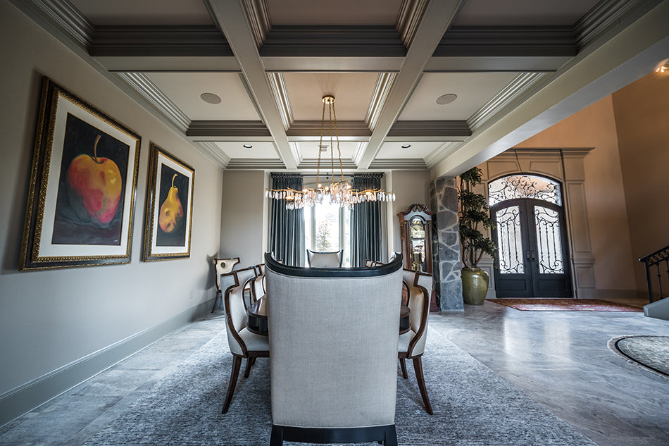 - The main floor features an elegant foyer open to the second‑floor, a coffered ceiling dining room, a great room with two‑story ceiling and fireplace, and a gourmet kitchen with two islands and attached hearth/breakfast room.