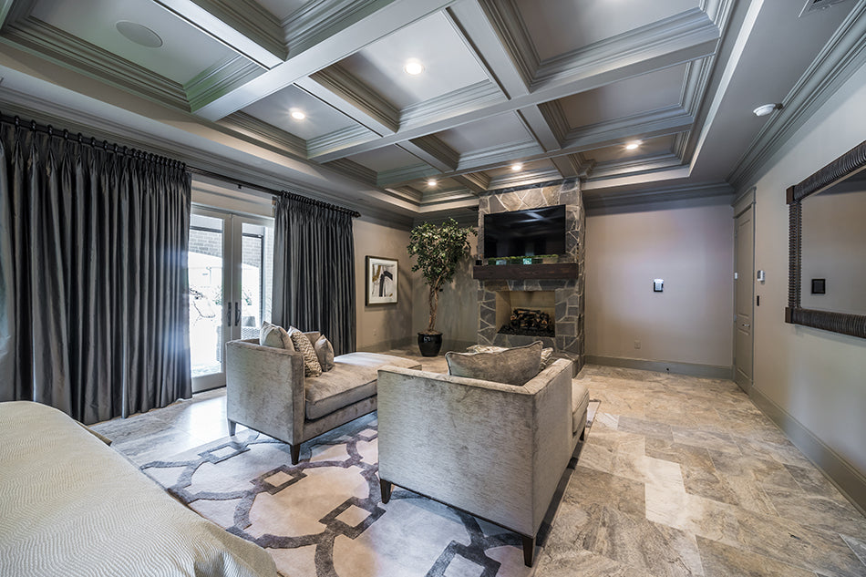 - The master suite is a dedicated retreat with a fireplace, boxed coffered ceiling, sauna‑style shower, freestanding tub, and generous his/hers closets.