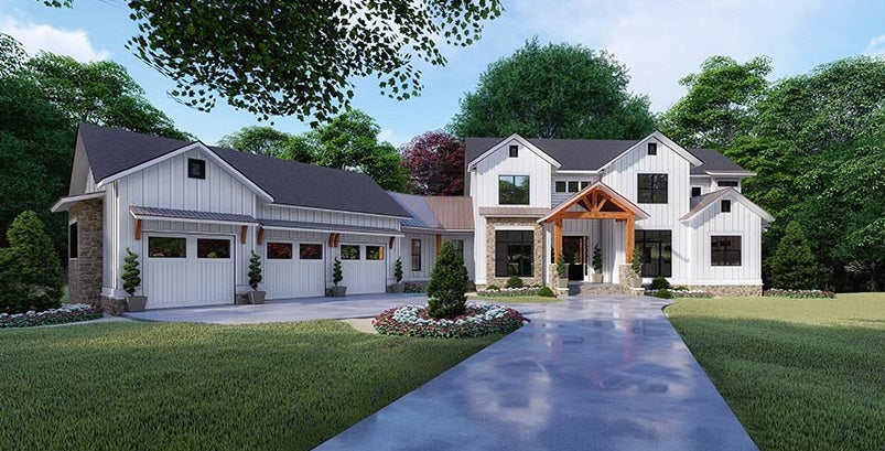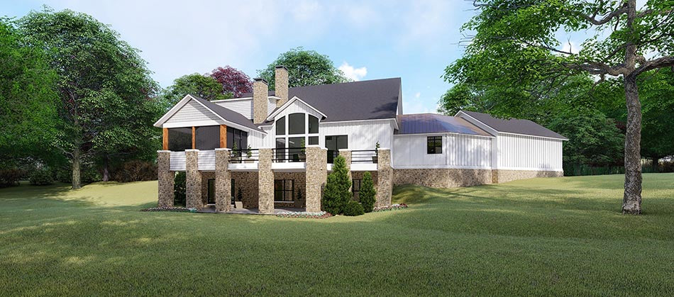 House Plan SMN 1036 Farmington Drive combines modern farmhouse elegance with spacious, family-friendly design. Offering 6 bedrooms, 5 full baths, and 1 half bath across 6,301 square feet, this plan showcases exceptional style and functionality. The exterior features metal roof accents, stone siding, and a 3-car angled garage for stunning curb appeal. Inside, the open-concept layout connects the great room, kitchen, and dining area, creating a warm and inviting flow for daily living or entertaining. The luxurious master suite includes its own fireplace, spa-like bath, and direct access to a screened porch. Upstairs, a loft and additional bedrooms provide flexible space, while the walk-out basement includes a home gym, secondary kitchen, and bonus living areas. Perfect for large families or multi-generational living, Farmington Drive stands out among house plans for its balance of beauty, comfort, and versatility.