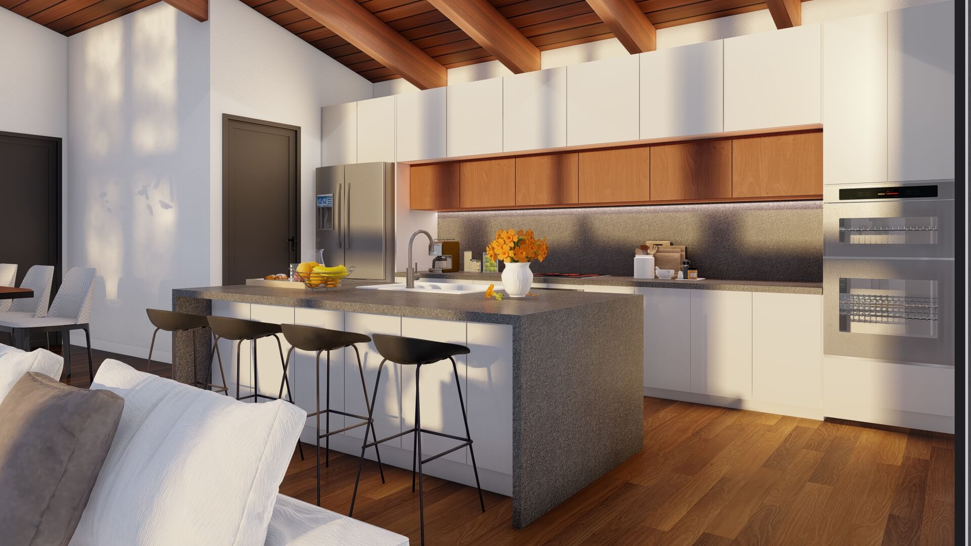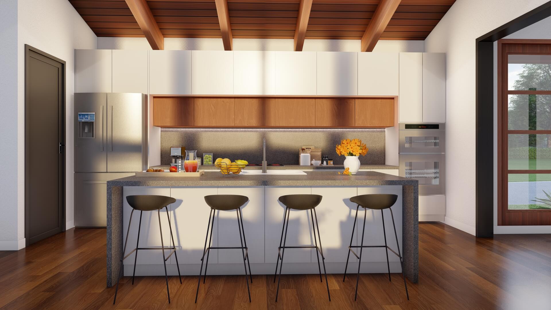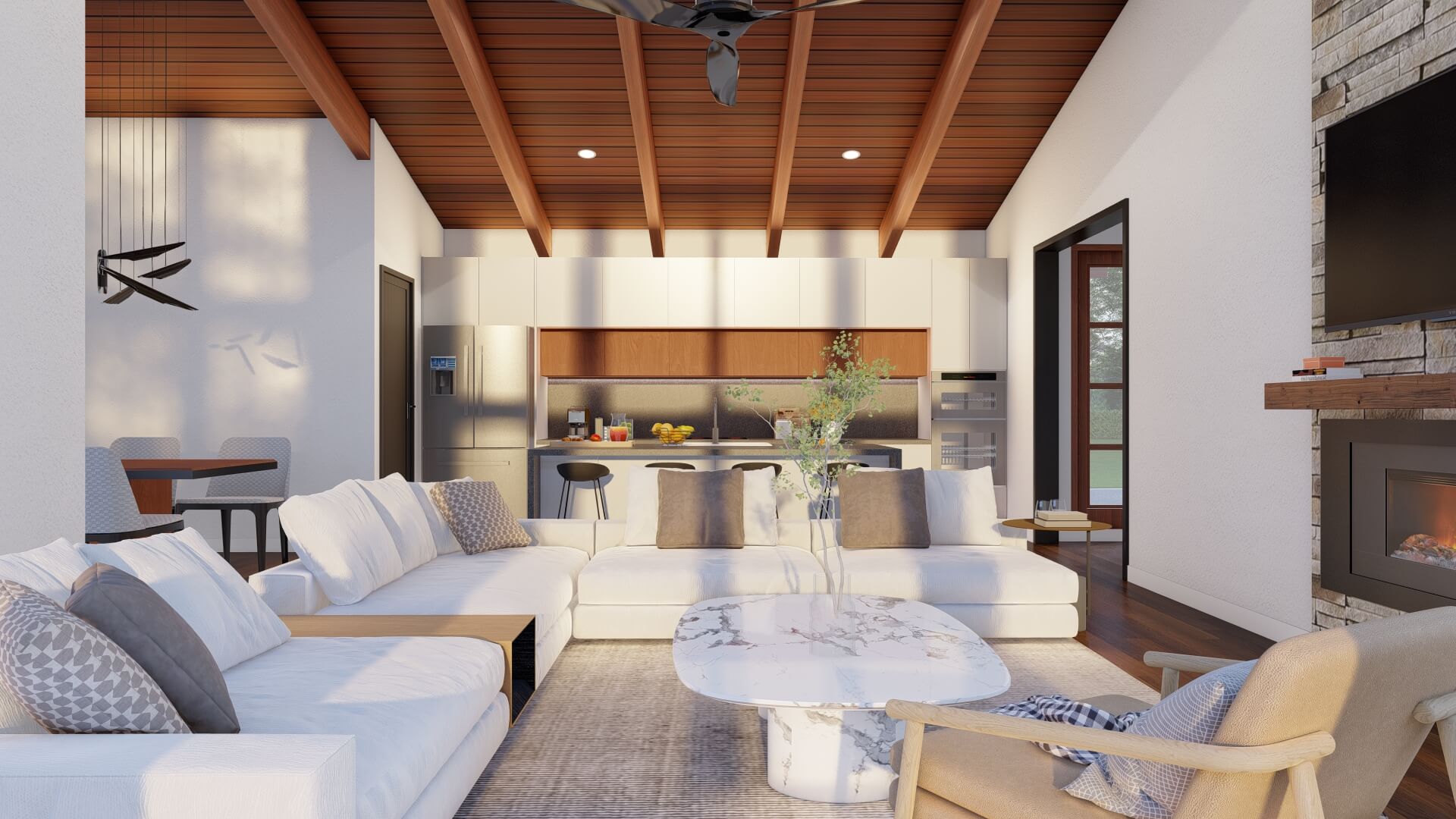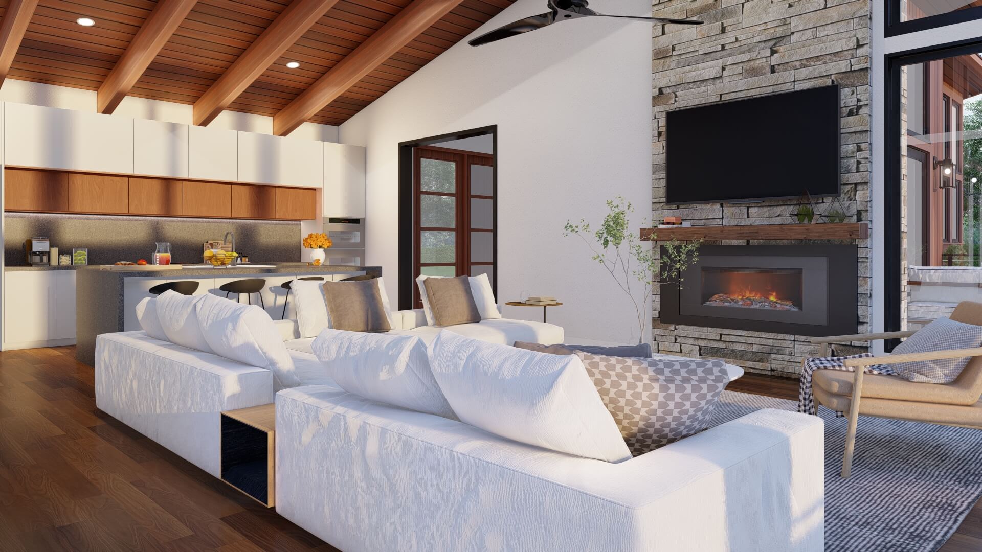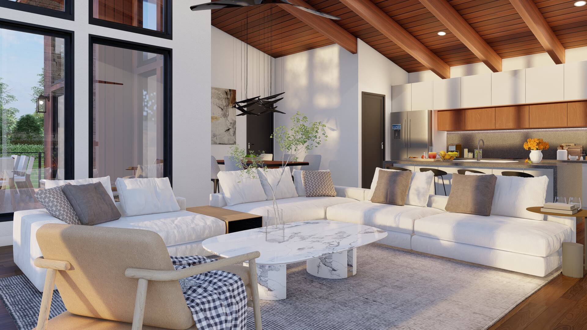 - Vaulted ceilings and exposed beams that elevate interior volume and character