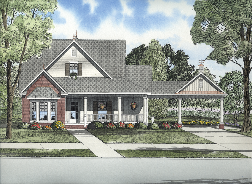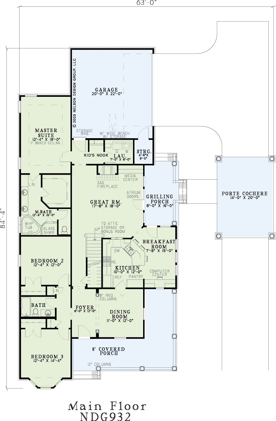 Columns on a deep front porch give historical value while the interior of this Nelson Design Group plan is designed with a high tech lifestyle in mind. A computer center is placed in the breakfast room and kitchen area for ease of mind while an angled bar with seating gives the family a great place to hang out. The nearby great room has a fireplace and media center and stairs leading to the upstairs bonus area. The well-designed master suite is located apart from the two additional bedrooms, for added privacy.