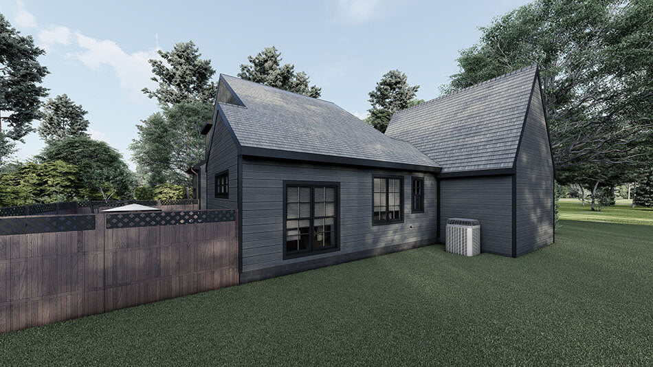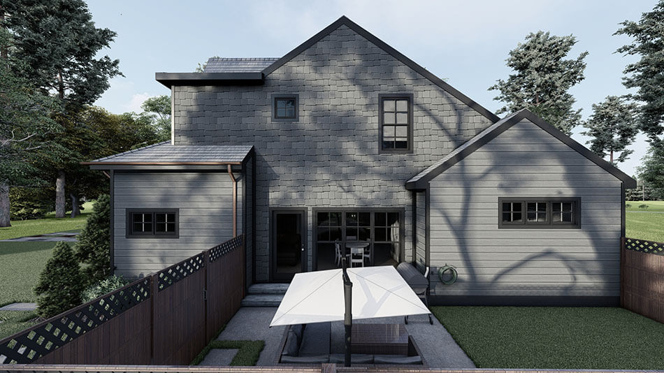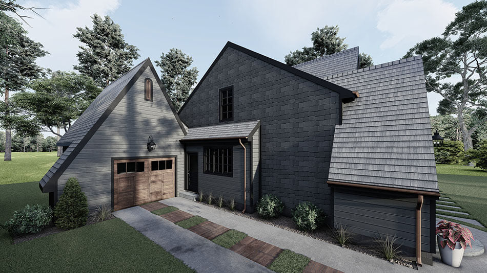 From award-winning designer Seth M. Nelson comes the newest addition to our European House Plan Collection. Spring Street offers a unique layout for you next home build. The modern black siding exterior offers a striking alternative for your curb appeal. An open space shared by the living, dining, and kitchen with an eat-at island offers tons of potential for entertaining guests, or gathering together for family dinners. An open patio adds to this element, making for the perfect outdoor living space to enjoy those relaxing summer nights. The master suite of Spring Street allows for both function and luxury, with a spacious bedroom and a clawfoot tub in the master bath. Two more bedrooms and an additional bathroom are located upstairs, and a garage complete with a storage closet is sure to satisfy your needs. The slightly narrow shape of the foundation of Spring Street allows for building on smaller/deeper lots as well. How would you customize this amazing house plan?