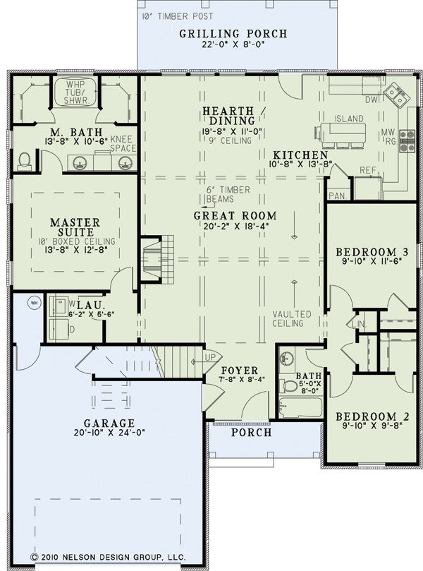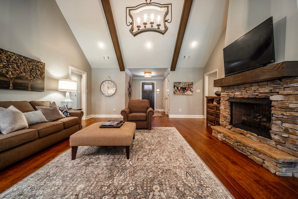 - Great Room features a vaulted ceiling with exposed timber beams and a cozy fireplace
