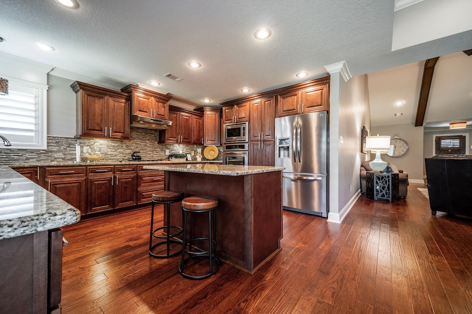- Kitchen includes a central island with informal seating, perfect for cooking, entertaining, or family meals