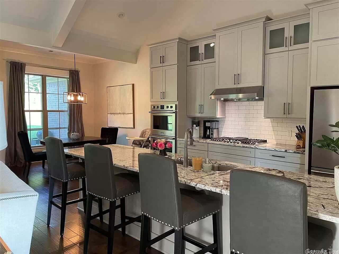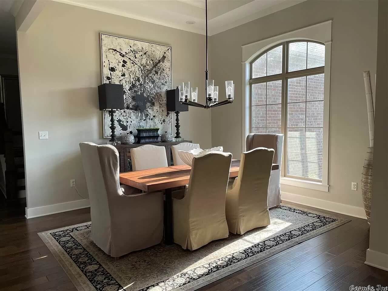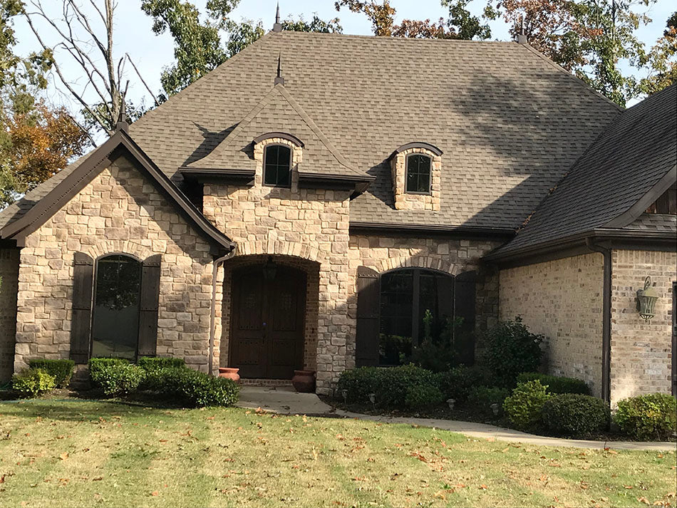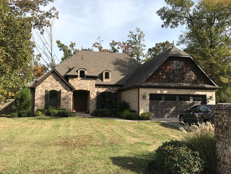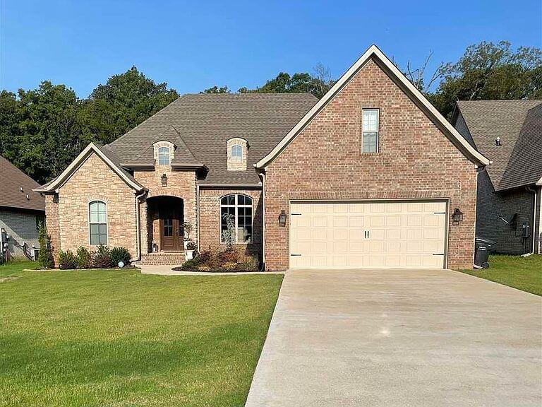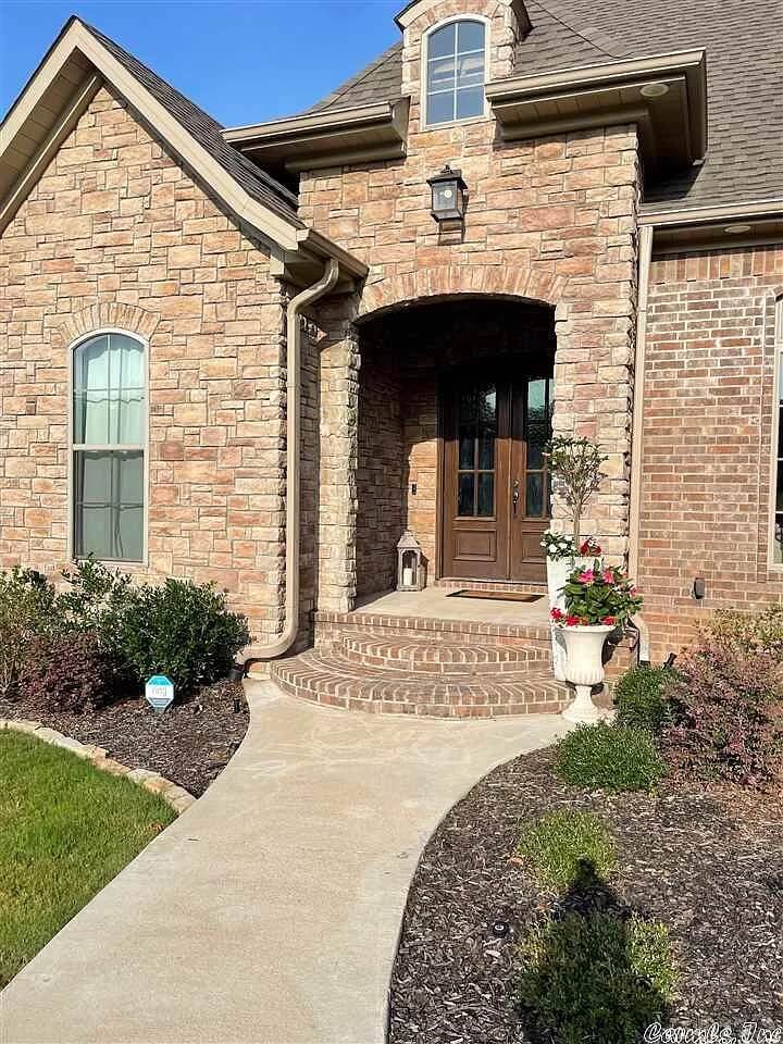 - Elegant brick and stone exterior with French‑country accents, including arched entry, arched windows, and hip-gable detail — strong curb appeal and timeless character.