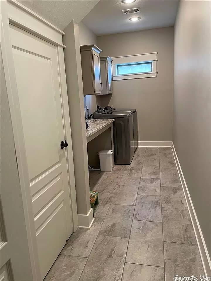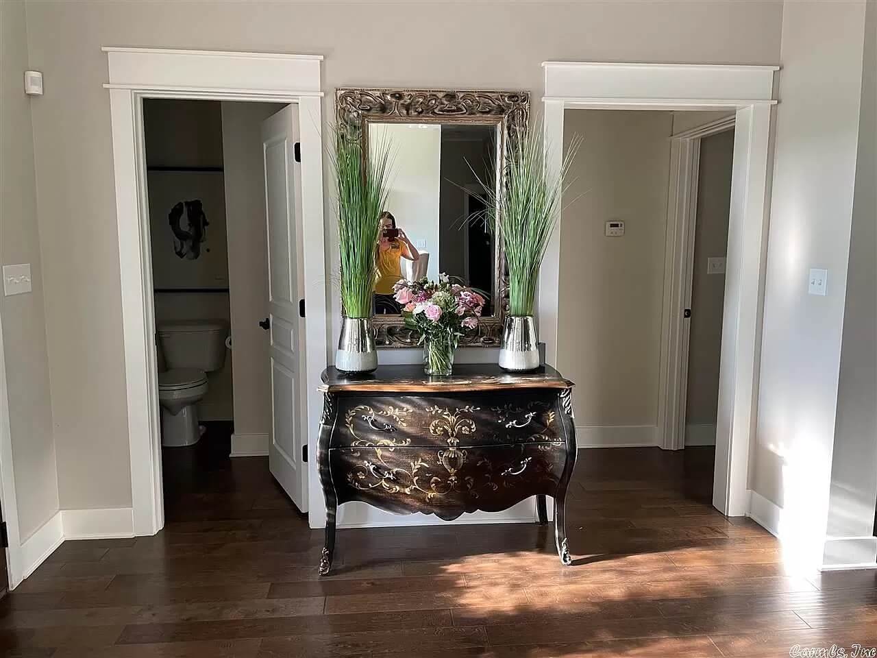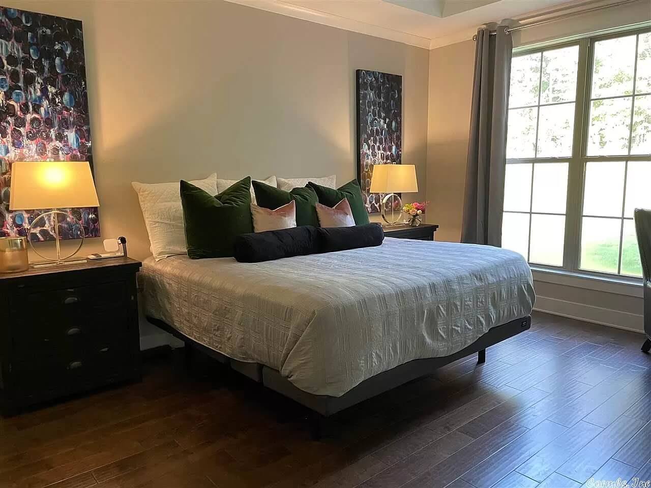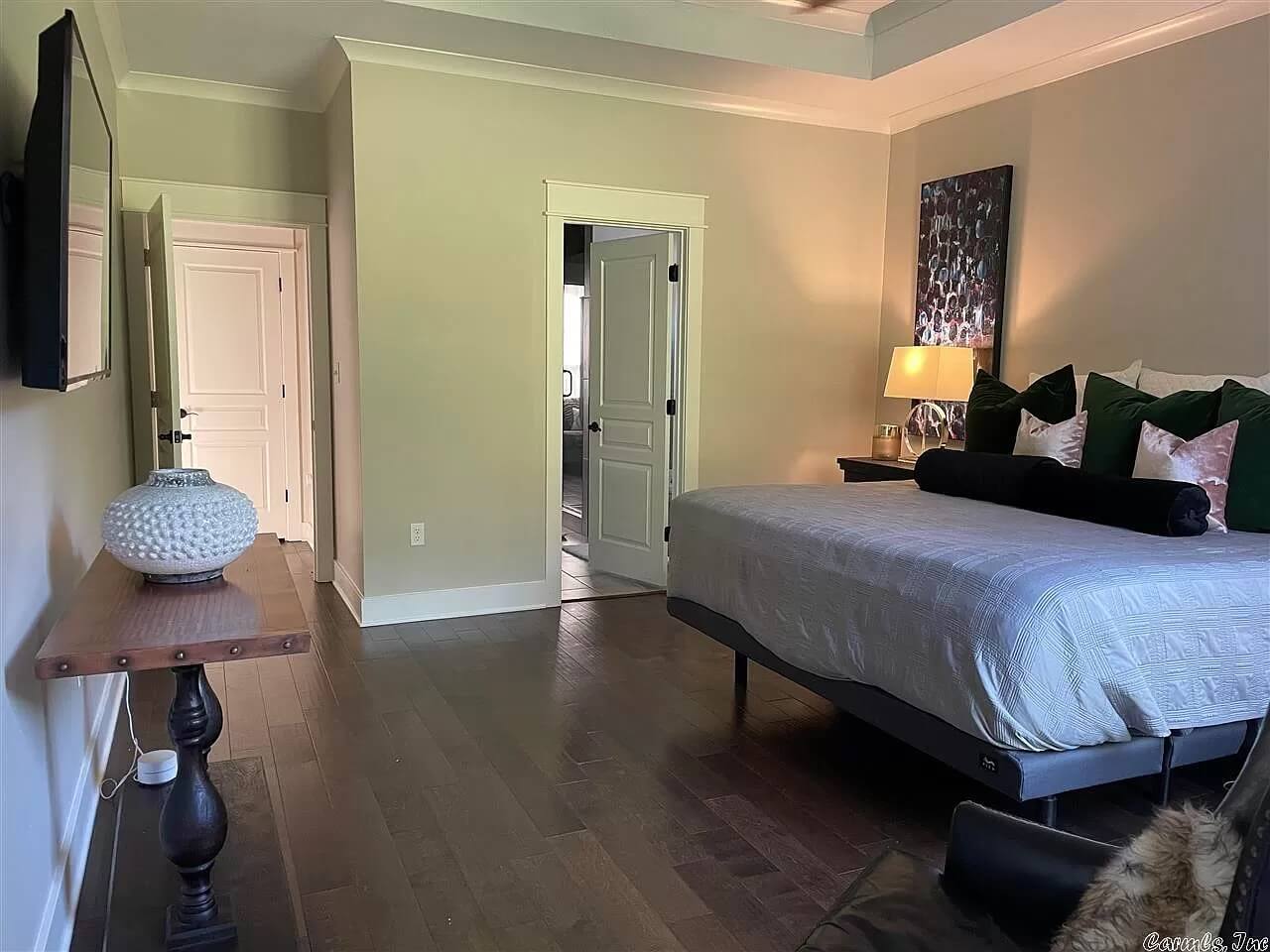 - Master suite with a 10‑foot boxed ceiling, luxurious master bath with whirlpool tub, dual vanities, separate shower, and a large walk‑in closet with built‑in ironing board — designed for comfort, privacy, and convenience.