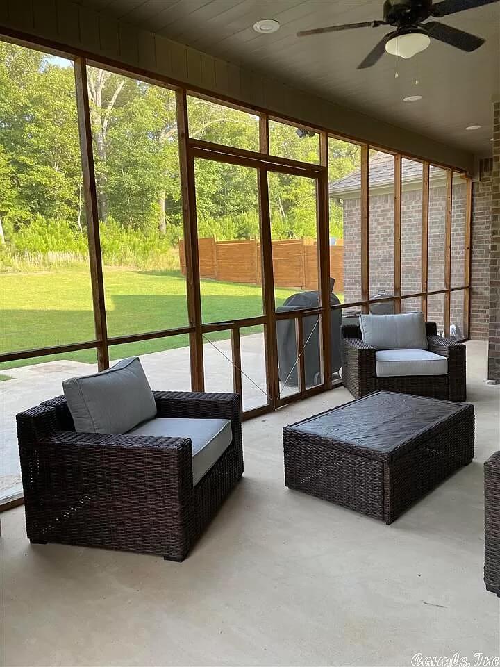 - Screened grilling porch with corner fireplace — perfect for outdoor dining, relaxation, or entertaining in comfort.