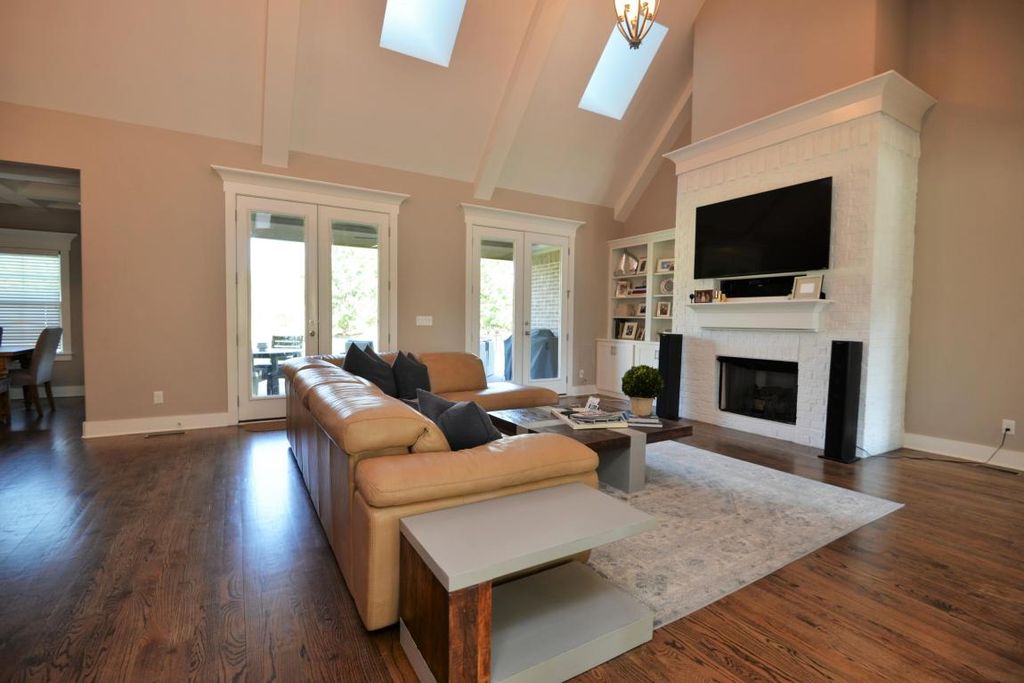 - Great Room featuring vaulted ceilings with timber beams, a fireplace, and French doors opening to the rear grilling porch — creating a warm, inviting central living space.