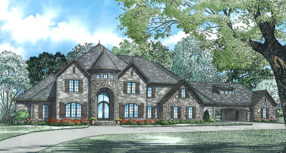 Corinthian is a majestic European‑style house plan offering 5,493 square feet of living space, with 4 bedrooms, 3 full baths, 2 half baths, and a 3‑bay side‑load garage plus a porte‑cochère carport. This two-story design delivers a dramatic entrance, grand proportions, and an open floor plan — perfect for homeowners seeking upscale living, formal elegance, and ample space for family and guests.