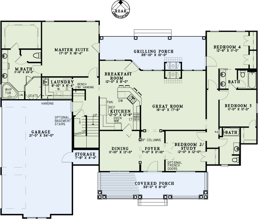 - Main-Floor Master Suite: The master bedroom opens directly to a rear porch. The private bath features a corner whirlpool tub, a makeup area, and a large walk-in closet.