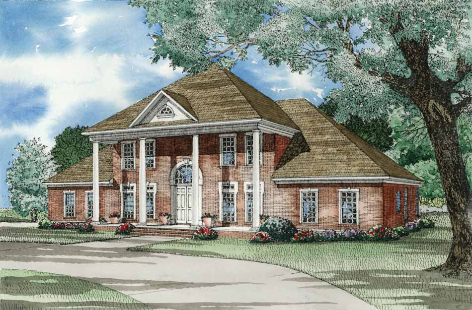 The scale of the imposing portico and fanlight front entry is carried on inside this spectacular showcase home. A graceful stairway rises from the two-story center foyer to three large bedrooms upstairs. The dining room is spacious enough for elaborate sit-down affairs, the great room ample for entertaining and the master suite is simply enormous, with its twin closets, separate vanities and whirlpool tub. The kitchen wing includes walk-in pantry, computer center, snack bar and cozy hearth room with grilling porch access.