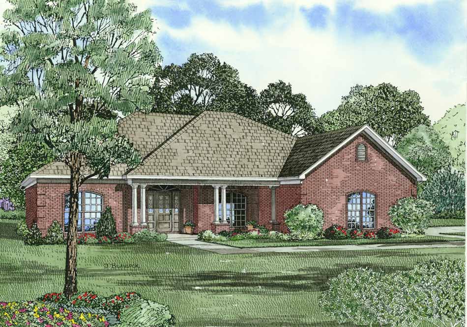 This attractive home plan from Nelson Design Group is sure to charm the neighborhood. The family chef will love preparing meals in this kitchen almost as much as serving them in the dining room defined by round columns. Gather your family around the fireplace on cold winter nights or treat them to a summer cookout on the large grilling porch at the rear of this home. Your family and visitors alike will certainly appreciate the privacy and convenience of this split plan design.