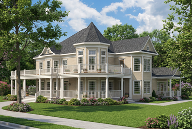 Designed for gracious living and entertaining, the exterior features traditional clapboard siding, a deep wrap‑around porch, tall windows, and a historic turret that adds unforgettable curb appeal. Inside, oversized rooms—including a large great room with a fireplace, a formal dining room enhanced by the turret, and a huge game room—create beautiful gathering spaces. A unique basement media room doubles as a well‑equipped kitchen and storm shelter, adding versatility and safety to everyday living. With a side‑load two‑car garage, open floor plan, and ample porch space, this plan is perfect for those who want both elegance and functionality.
