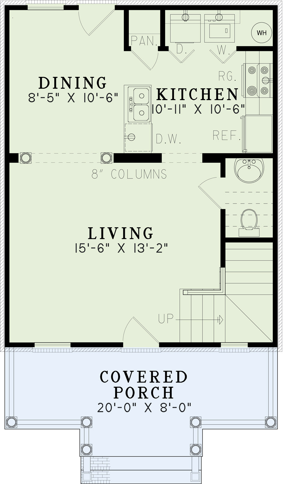 This plan features 2 bedrooms, 2 full bathrooms, and 1 half bath, organized across two stories to maximize every square foot. The main floor encompasses approximately 500 sq ft, while the upper level adds roughly 480 sq ft, for a combined 980 sq ft of living space. A covered front porch extends the home’s form and welcoming feel with an additional 138 sq ft of outdoor space.
