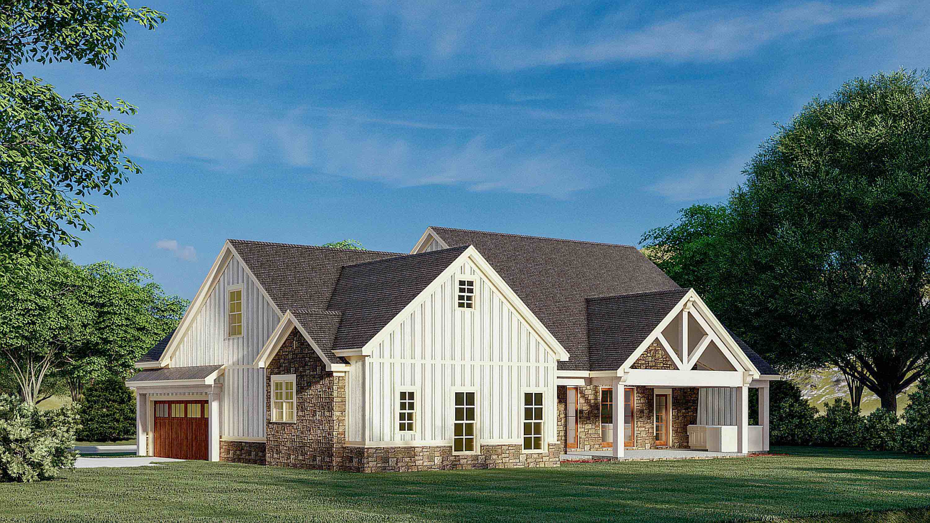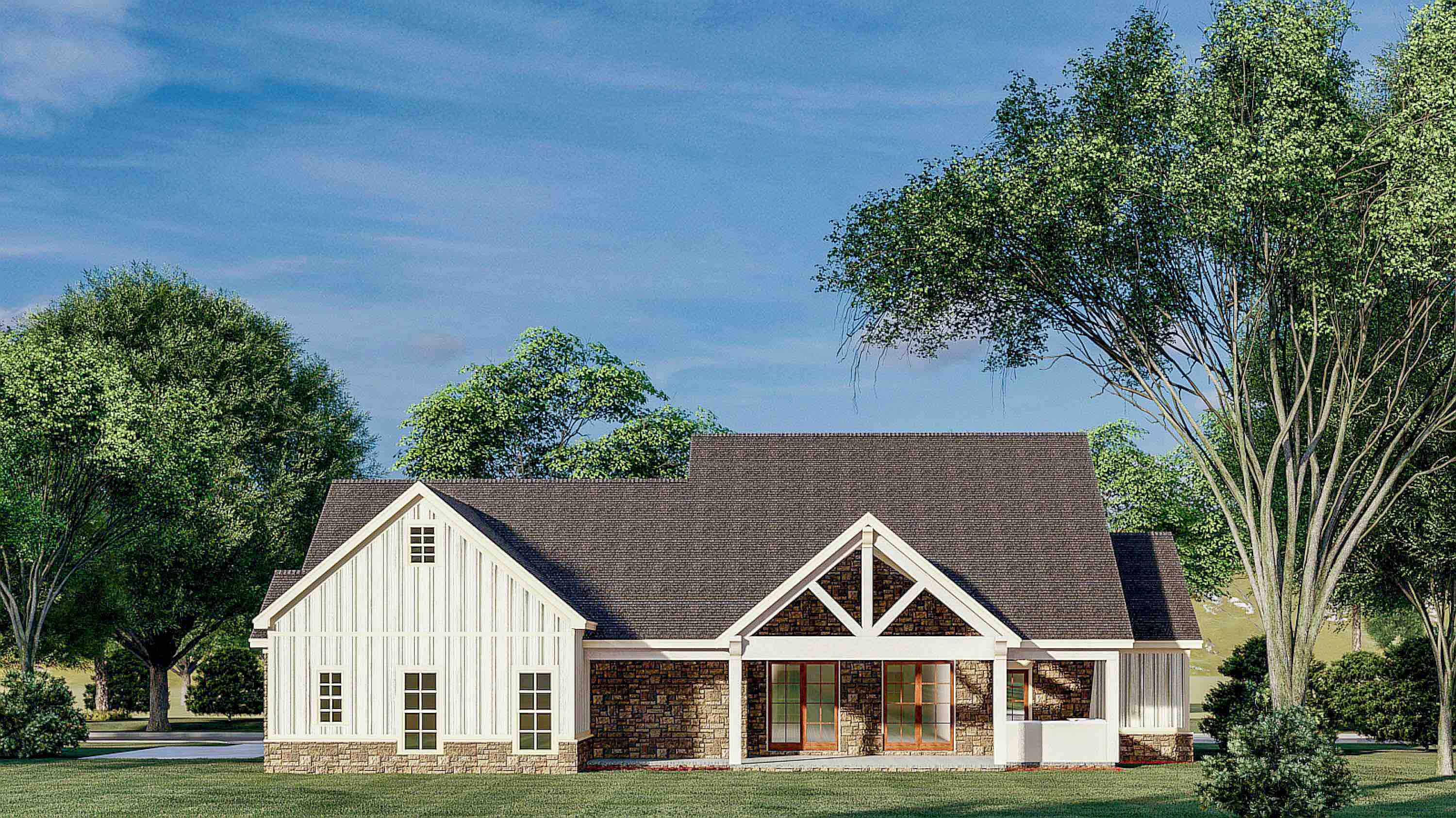 - Inviting exterior with board-and-batten siding, stone accents, and a welcoming front porch