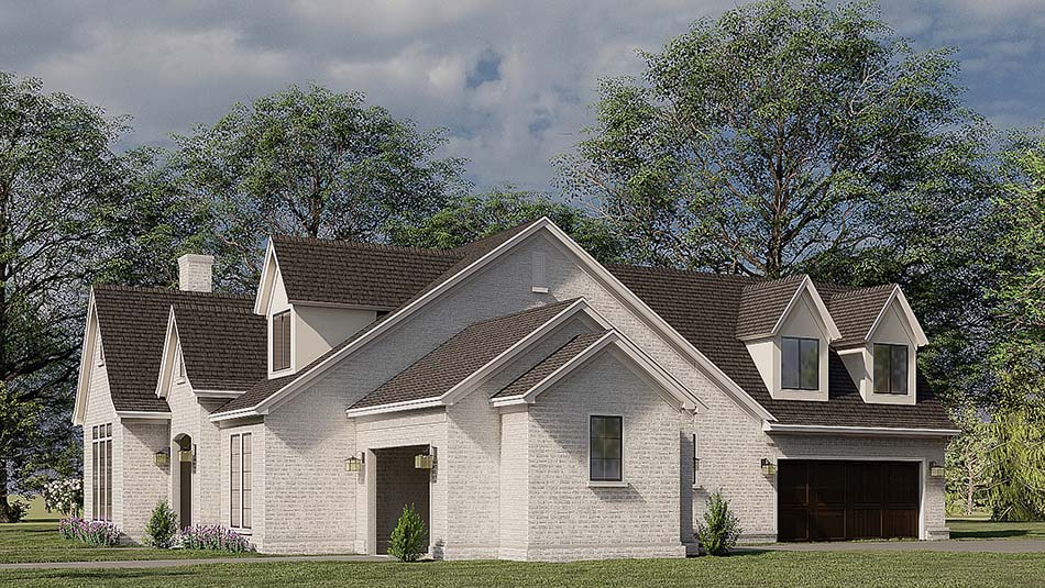 The front façade exudes charm with warm white brick, graceful arches, and expansive windows that bathe the entry in natural light. Step inside to an open-floor concept where the great room and dining area flow into a chef-ready kitchen featuring a high-low bar island and step-in pantry—ideal for entertaining or family life. The main-level master suite is a sanctuary of comfort, complete with dual walk-in closets, a freestanding tub, glass-enclosed shower, and abundant natural light through transom windows.