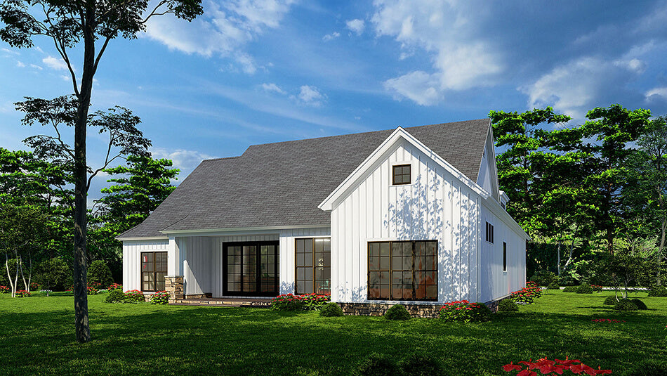 The home's exterior boasts a white board-and-batten facade complemented by a stone skirt and a mix of metal and shingle roofing. A covered front porch with double doors enhances its curb appeal.