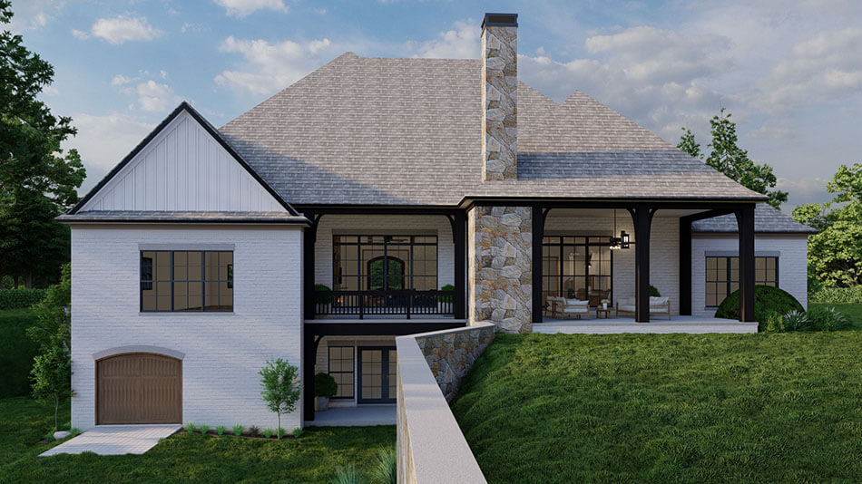 The 4-bay angled garage provides ample space for vehicles and storage. Rear decks and porches extend the living space outdoors, creating seamless indoor-outdoor living opportunities.