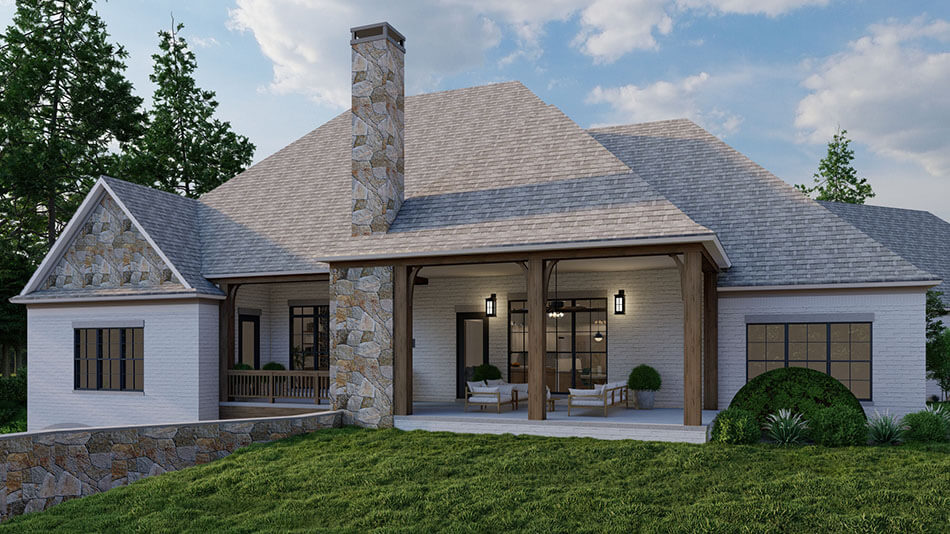 With a width of 110’ 11” and a depth of 98’ 2”, Timberstone Place presents a broad and stately presence. Stone and wood accents on the exterior evoke classic craftsman character, while a large covered porch provides inviting outdoor living space. -