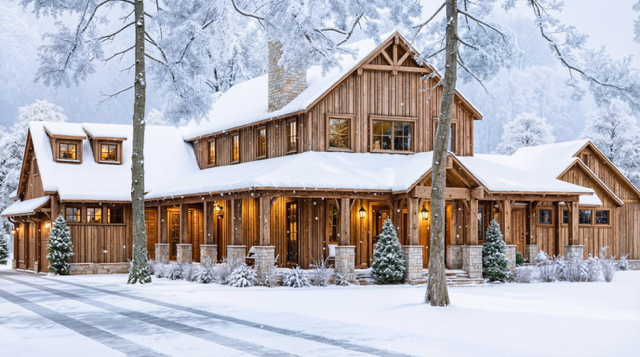• Rustic-modern exterior with stone and wood accents.