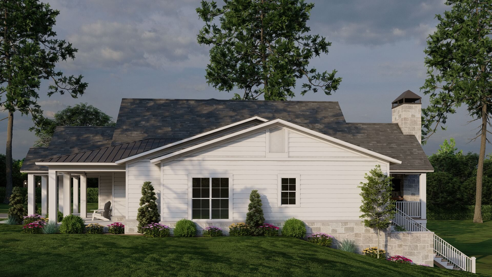 The opposite wing of the home features three additional bedrooms—one of which is ideal for a guest suite, complete with its own bathroom. The other two bedrooms share a Jack-and-Jill bathroom. A covered porch at the rear of the home adds additional outdoor living space, perfect for relaxed afternoons or evening entertaining.