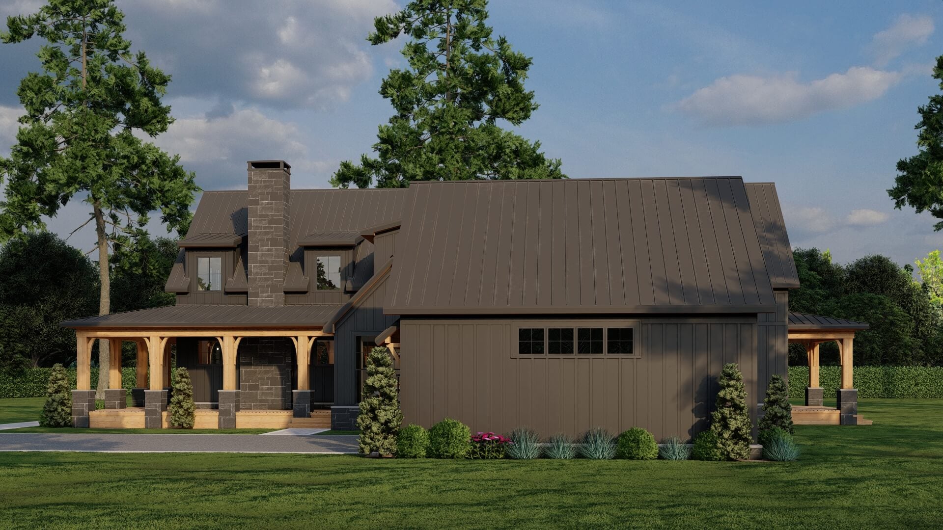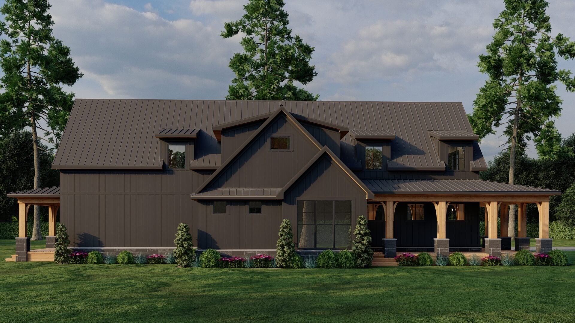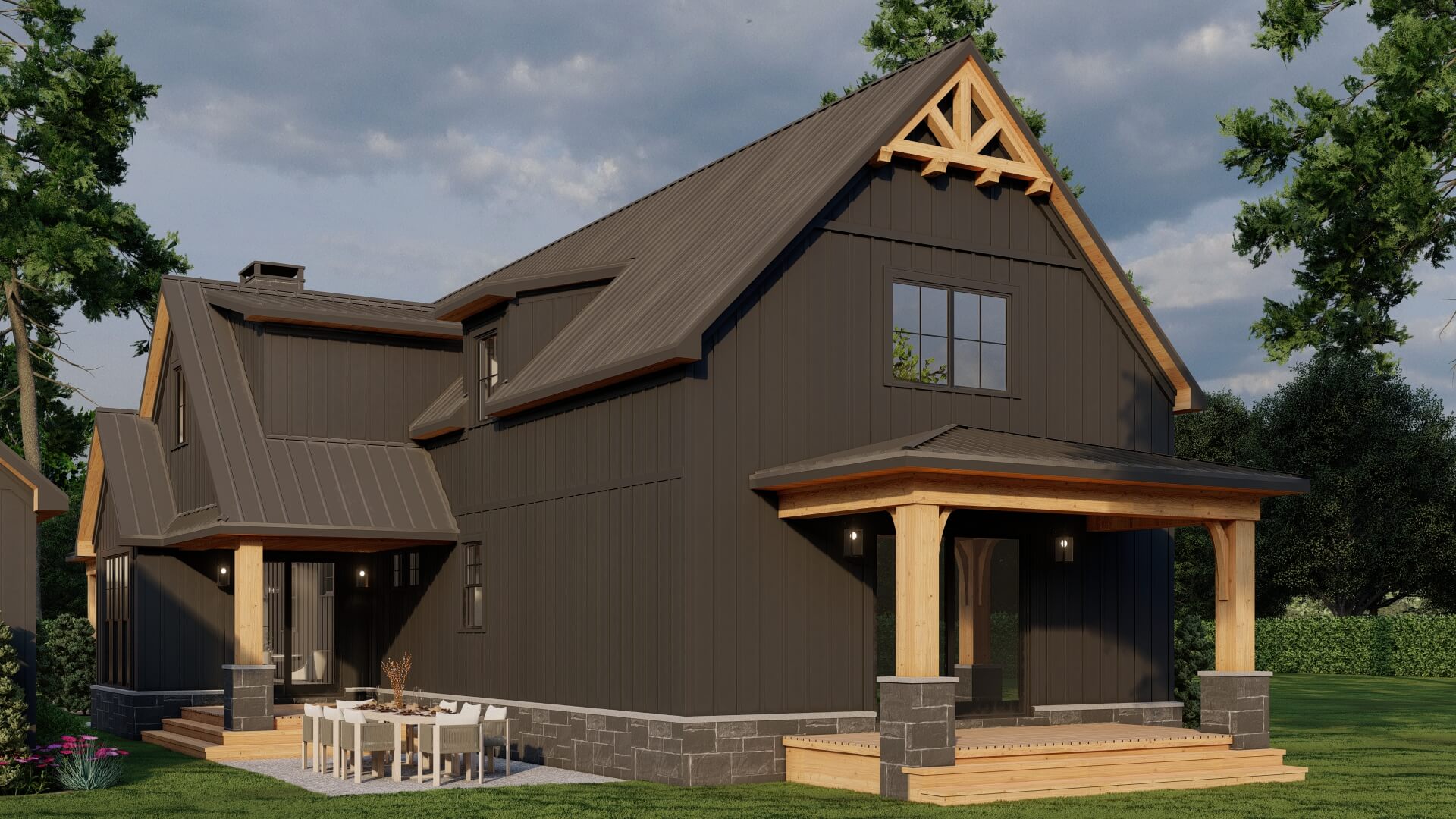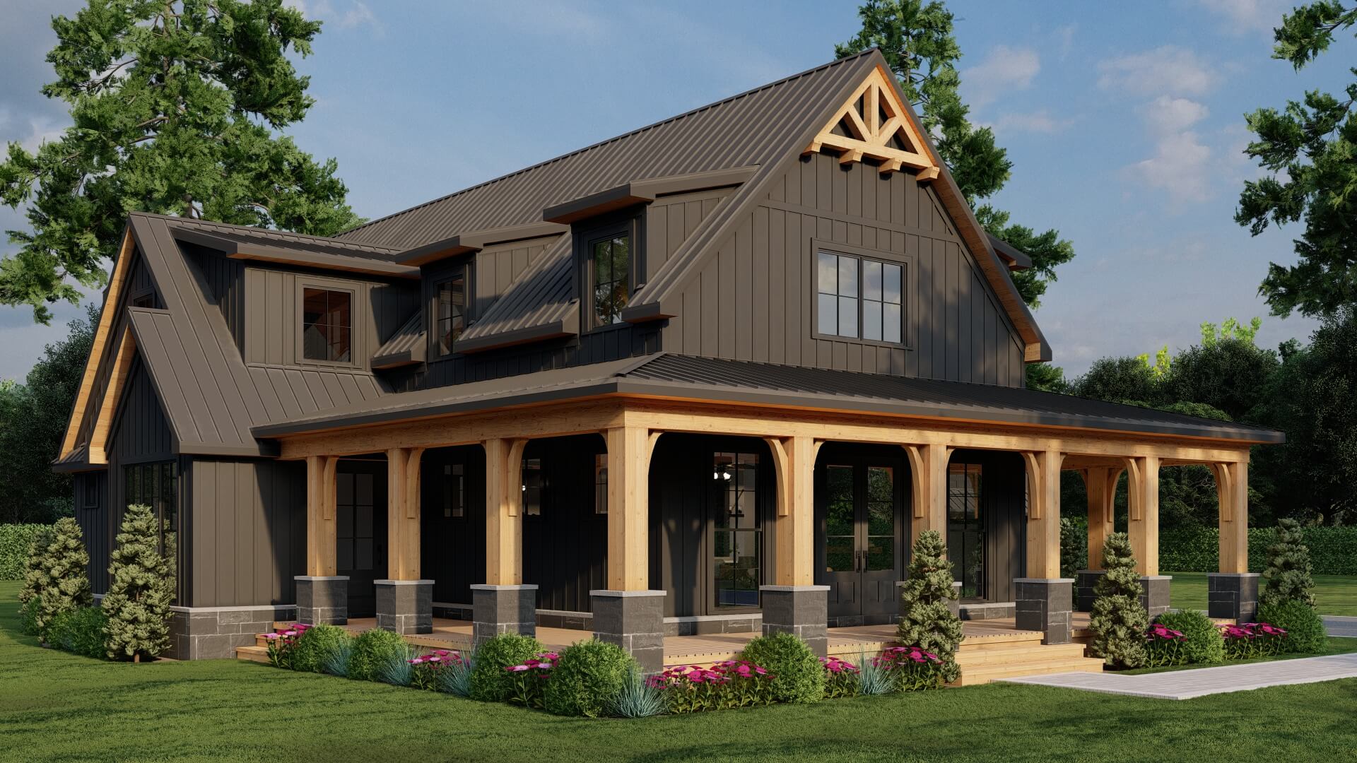 - The exterior design delivers curb appeal with a large wrap-around front porch, options for contrasting finishes (such as a white farmhouse or dark natural wood exterior), and barn-inspired elements for visual interest.