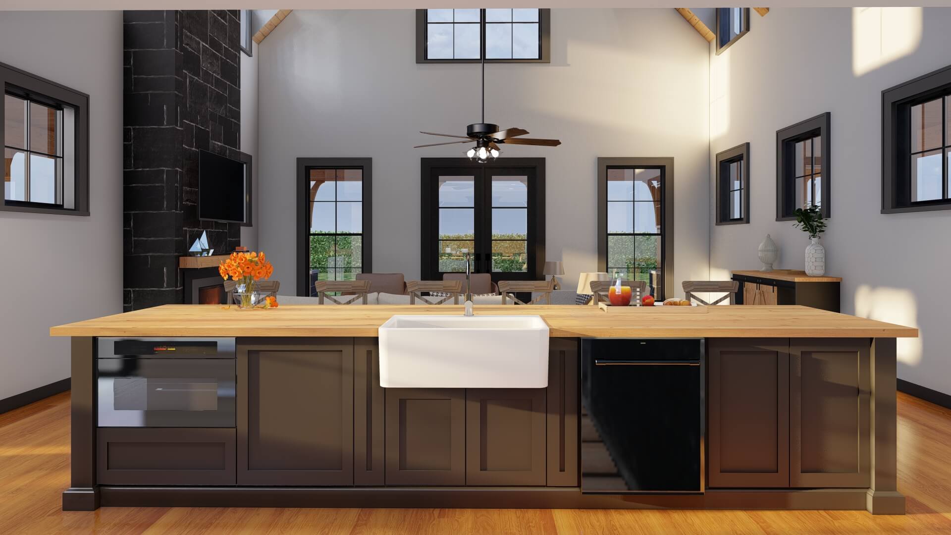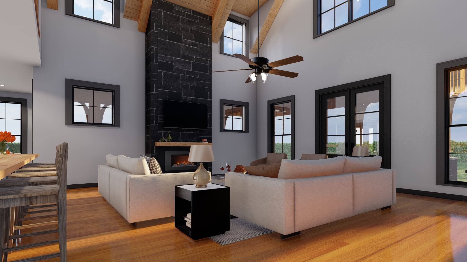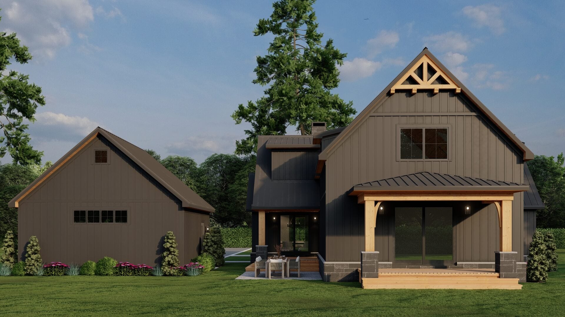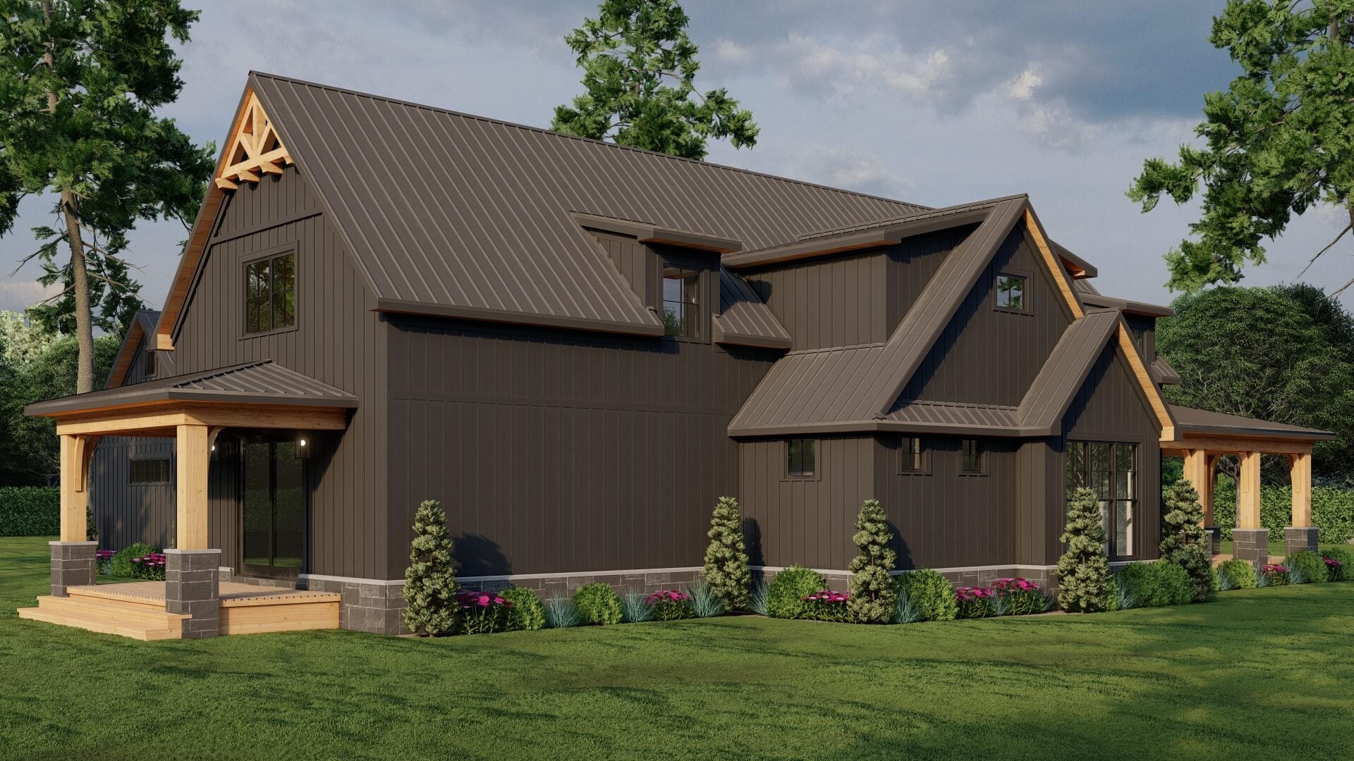 - The exterior design delivers curb appeal with a large wrap-around front porch, options for contrasting finishes (such as a white farmhouse or dark natural wood exterior), and barn-inspired elements for visual interest.
