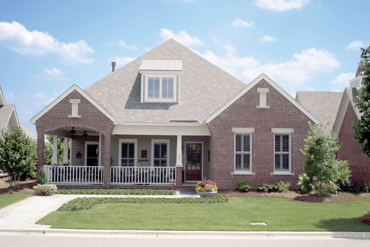 The Jasmine’s exterior is warm and inviting, featuring a wrap-around wooden front porch supported by classic arched brick columns—perfect for relaxing evenings or welcoming guests with Southern hospitality.