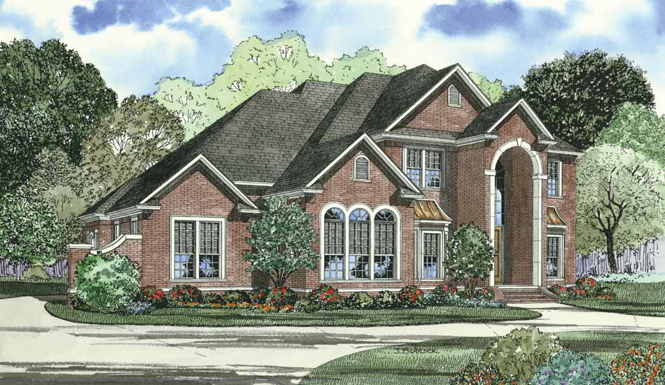Believe it or not, this gorgeous home created by Nelson Design Group has five bedrooms and five baths. The arched entry and windows are outlined with an architectural pre-cast stone element. The dining room and study bay windows are both accented with a stylish copper roof that will superbly season overtime. A grand foyer with curved staircase sets the tone for this magnificent home design. The heart of this home is the expansive kitchen with adjoining gathering room, breakfast room and screened porch. Located privately on the main level is the master suite with an extraordinary private bathroom with fireplace and tornado room/master closet. Whether you desire a nearby nursery for the precious addition to your family, or a home office you?ll have a world of options with this design. The upper level includes three bedrooms, an optional bonus room and plenty of bathroom access.