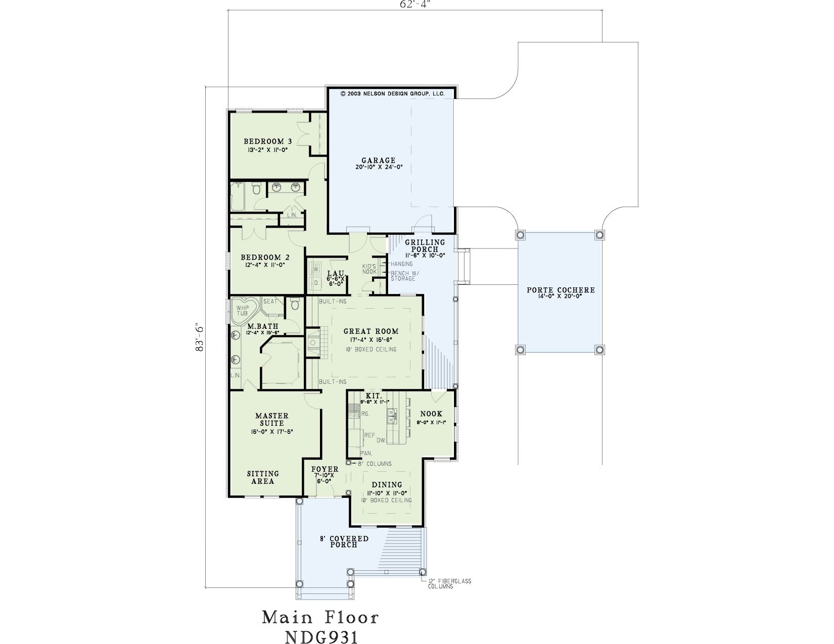 A deep covered porch is a bonus in this lovely Nelson Design Group home plan. A ten-foot boxed ceiling, built-ins and view of the side-grilling porch enhance the great room, making the perfect area for entertaining. The kitchen and breakfast nook shares a handy serving bar with extra seating and adjoining dining area, with boxed ceiling. An oversized master suite with sitting area and glorious private bathroom is placed opposite two additional bedrooms located at the rear of the home.