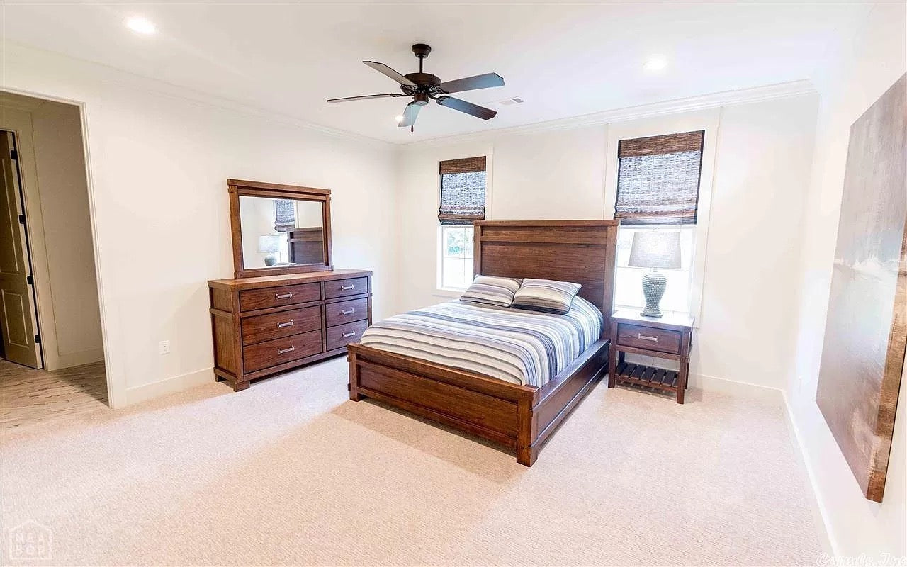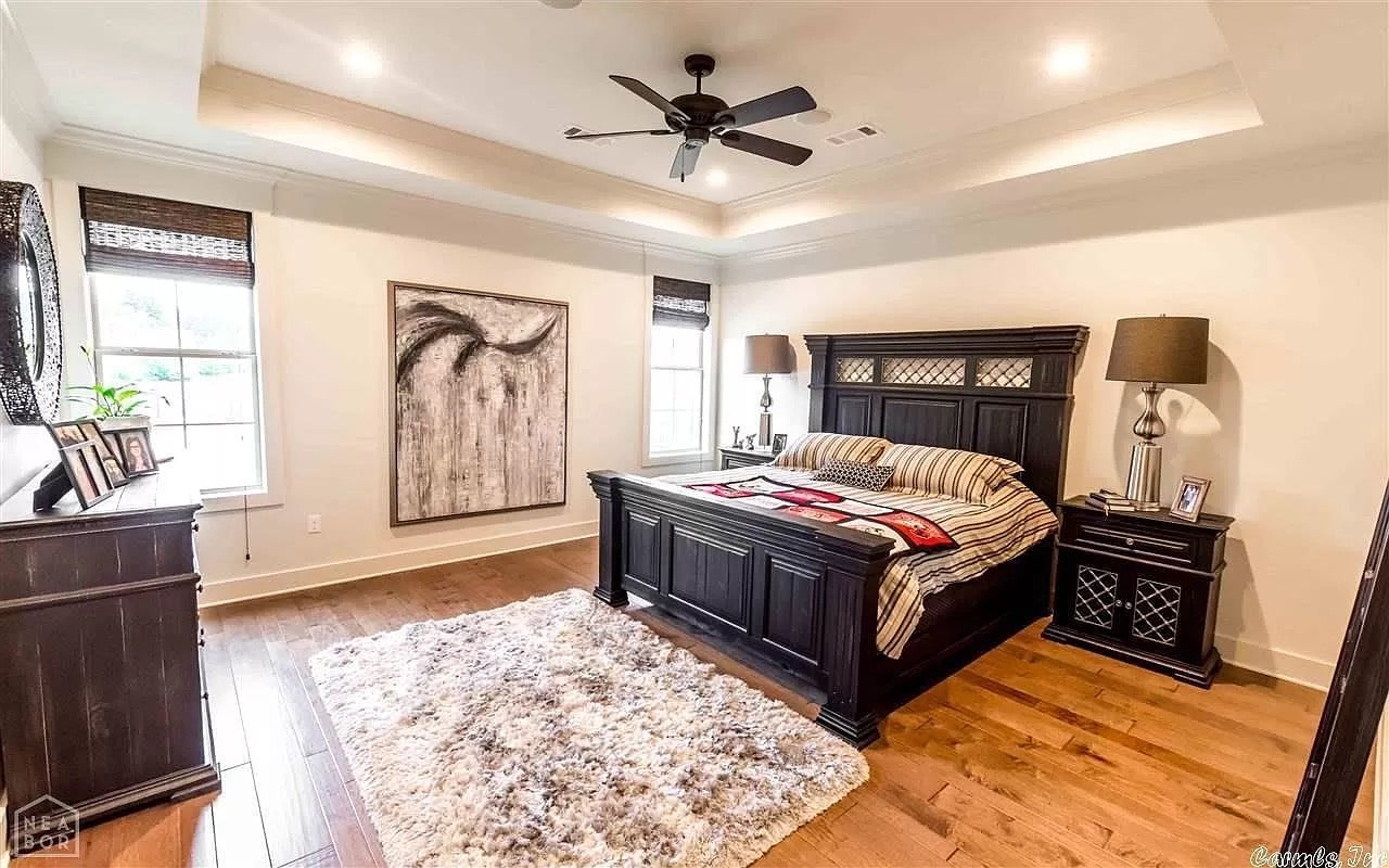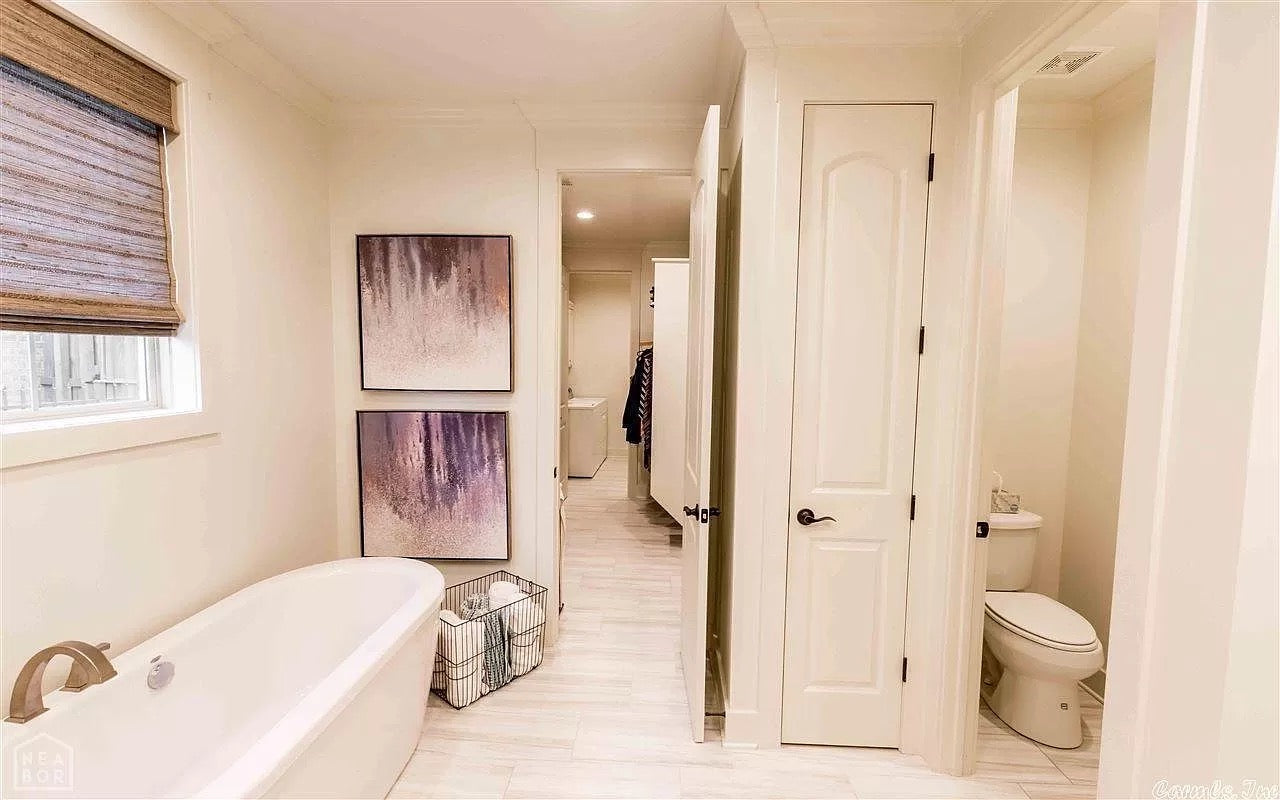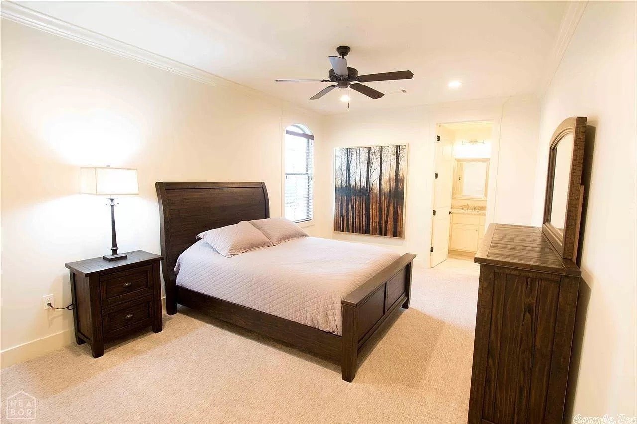 The master suite is positioned for peace and seclusion, offering generous closet space, a luxurious bath, and ease of access to adjacent conveniences like the laundry or a private deck. -