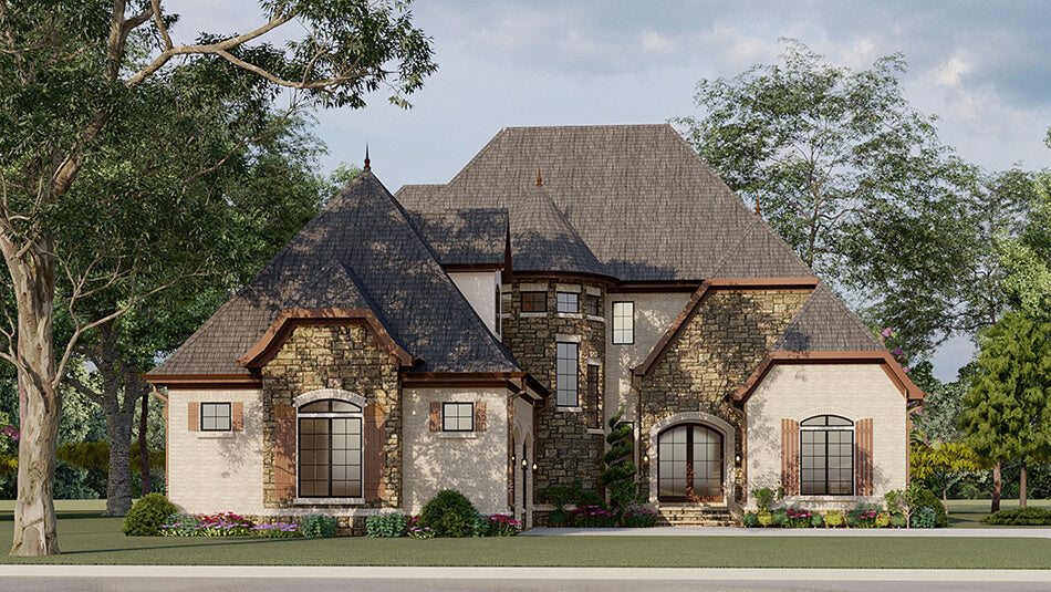- Elegant European façade with soaring rooflines, a mix of stone and brick siding, arched architectural elements, and a turret that lends castle‑like character