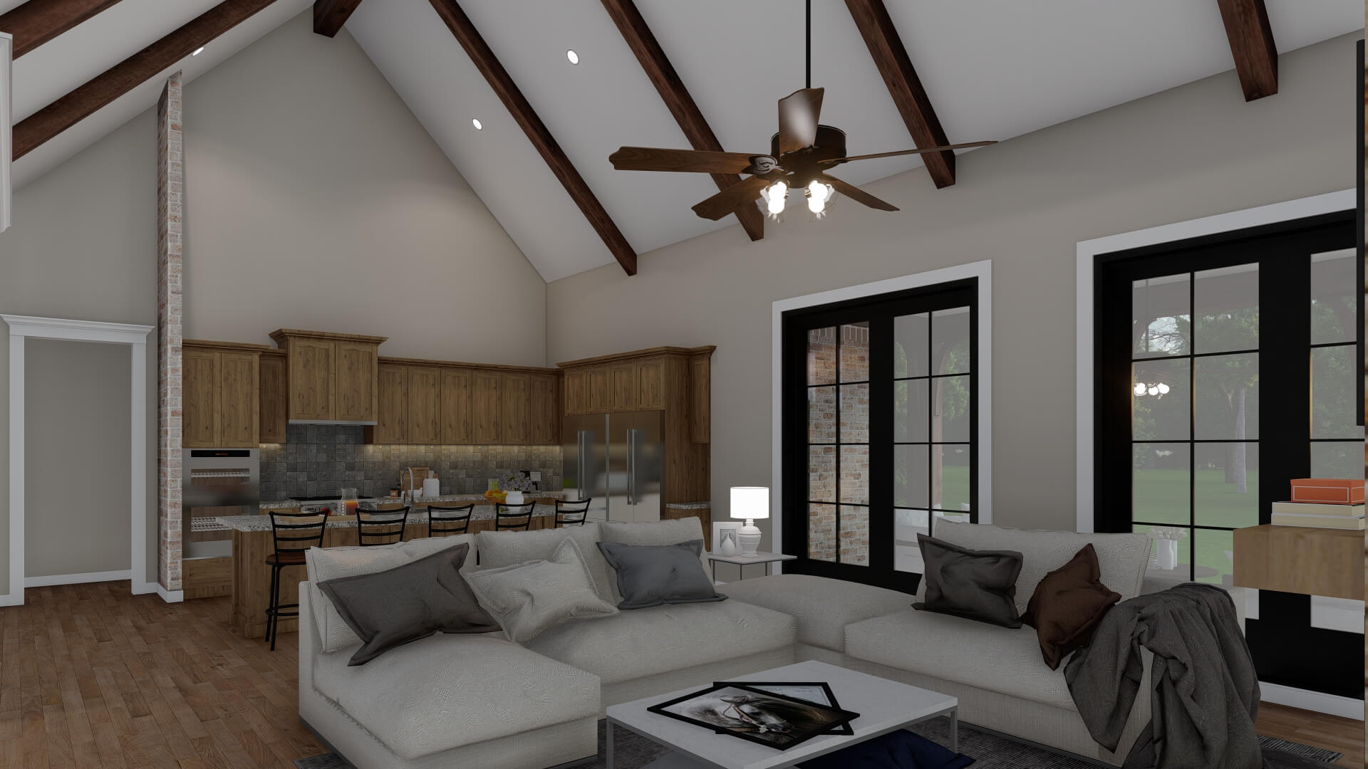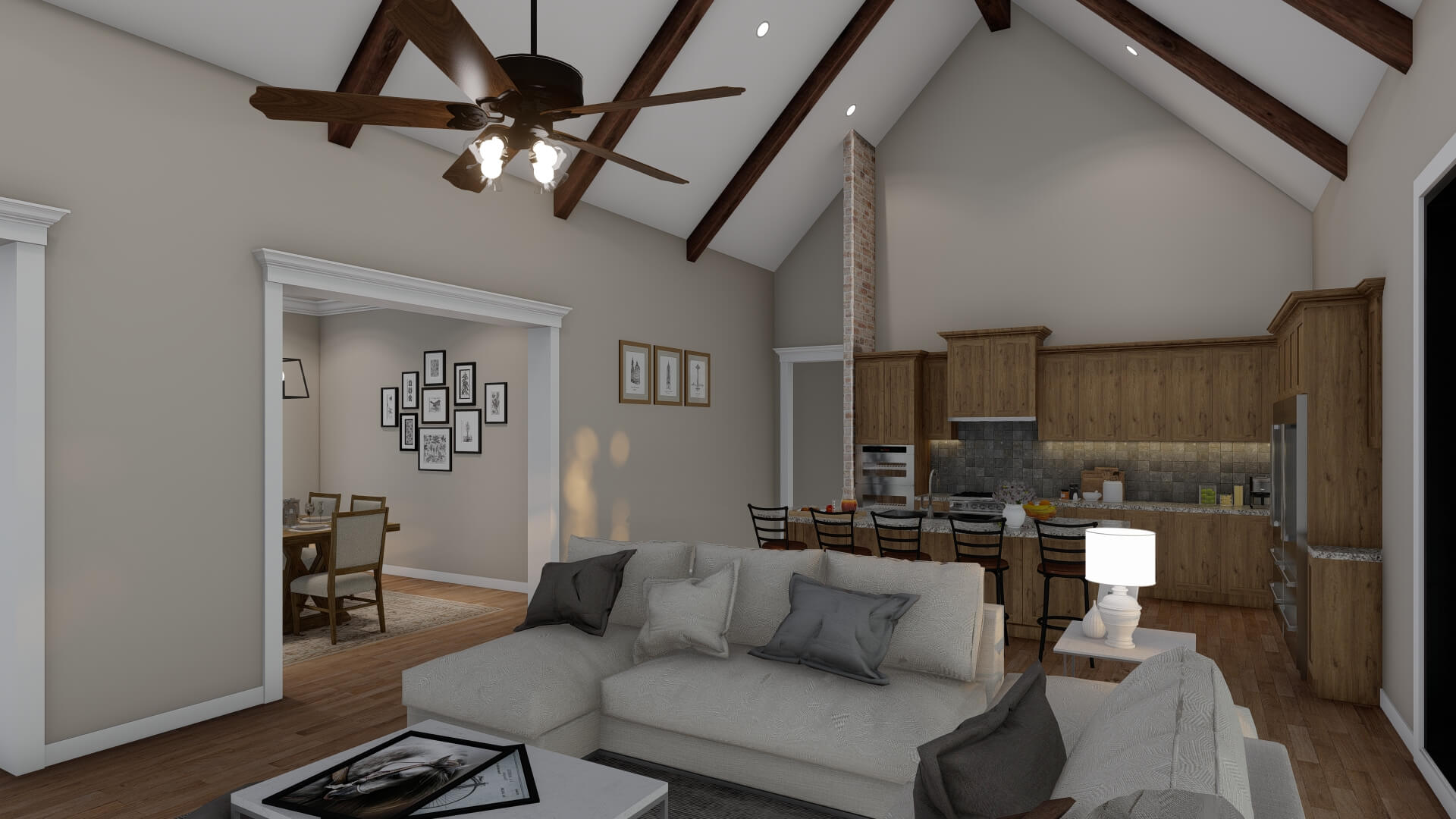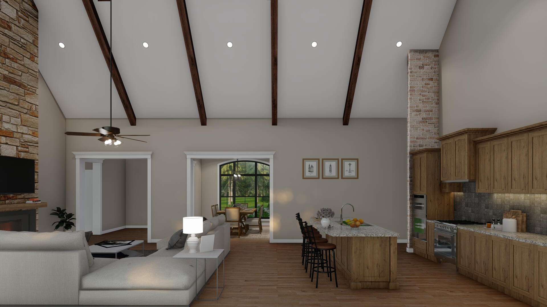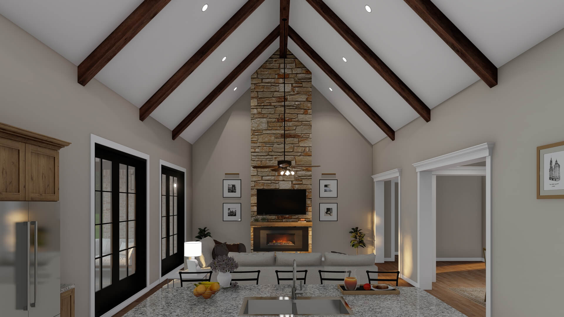 - Open Living & Dining Core – The great room opens directly to the dining area and kitchen, creating an airy, connected space with vaulted ceilings and a fireplace as a focal point.