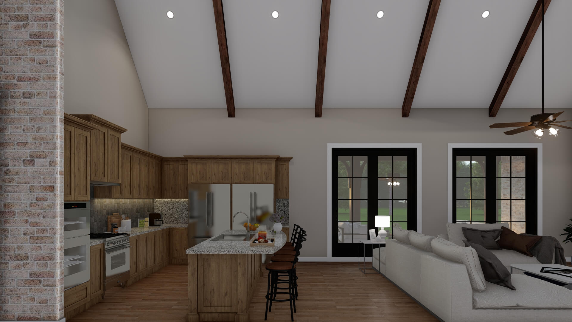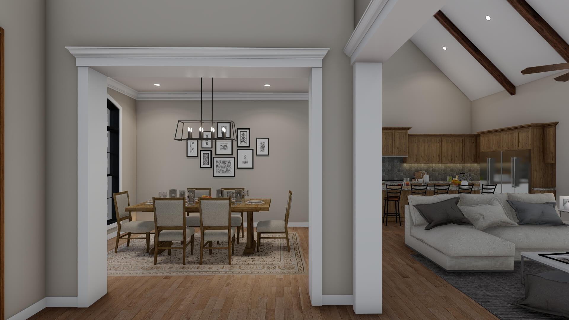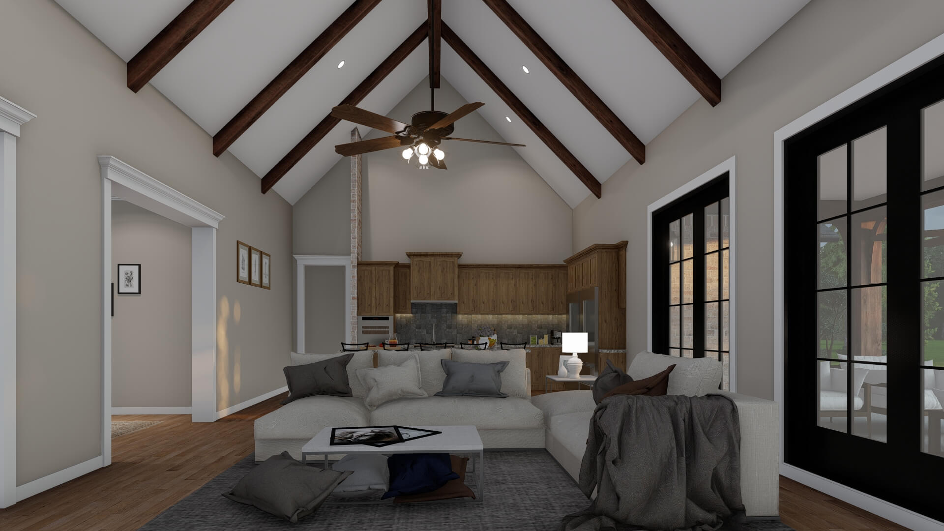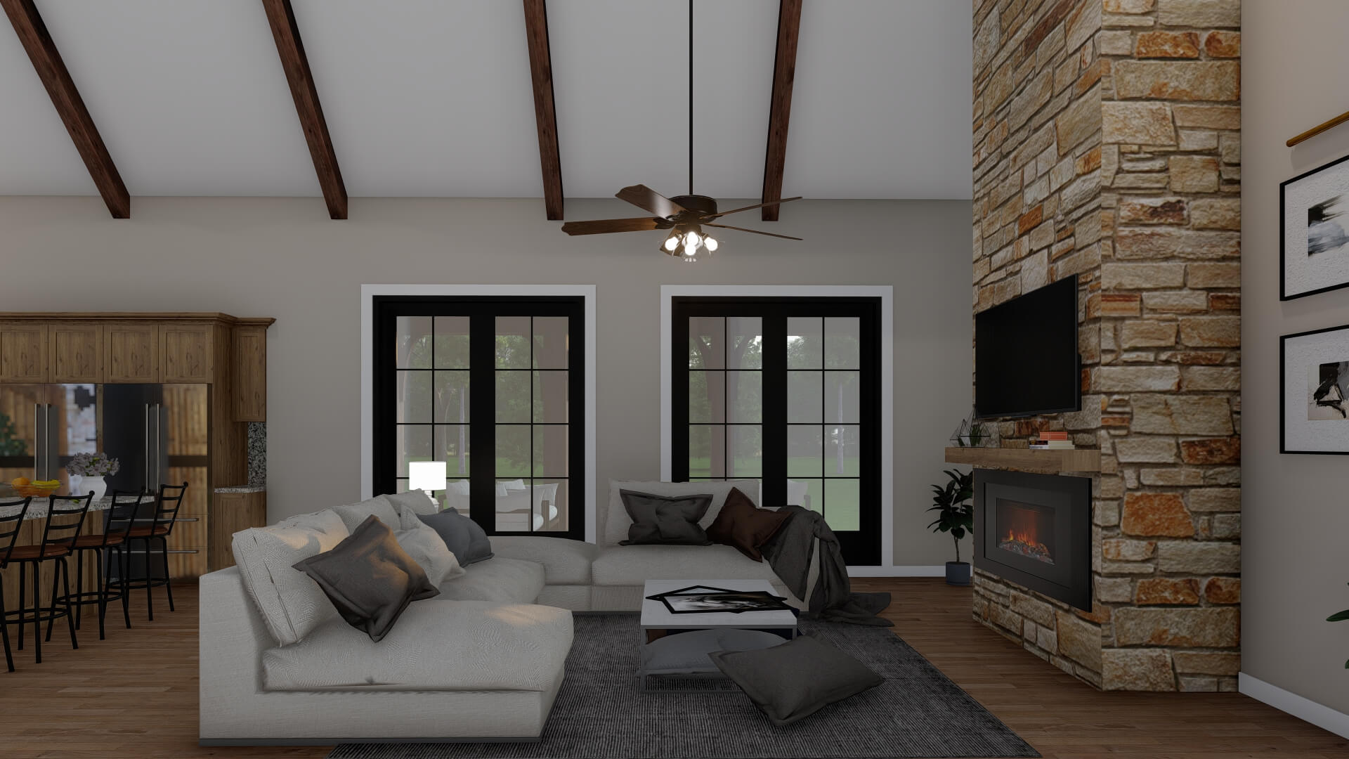 - Open Living & Dining Core – The great room opens directly to the dining area and kitchen, creating an airy, connected space with vaulted ceilings and a fireplace as a focal point.