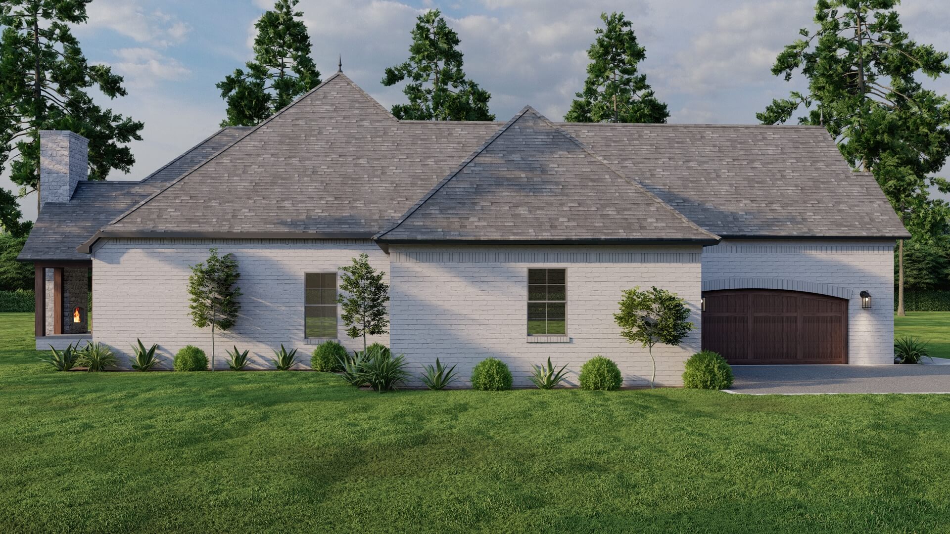 A covered rear porch with vaulted ceiling and outdoor fireplace expands the living space, alongside a separate grilling patio for warm-weather entertaining. -