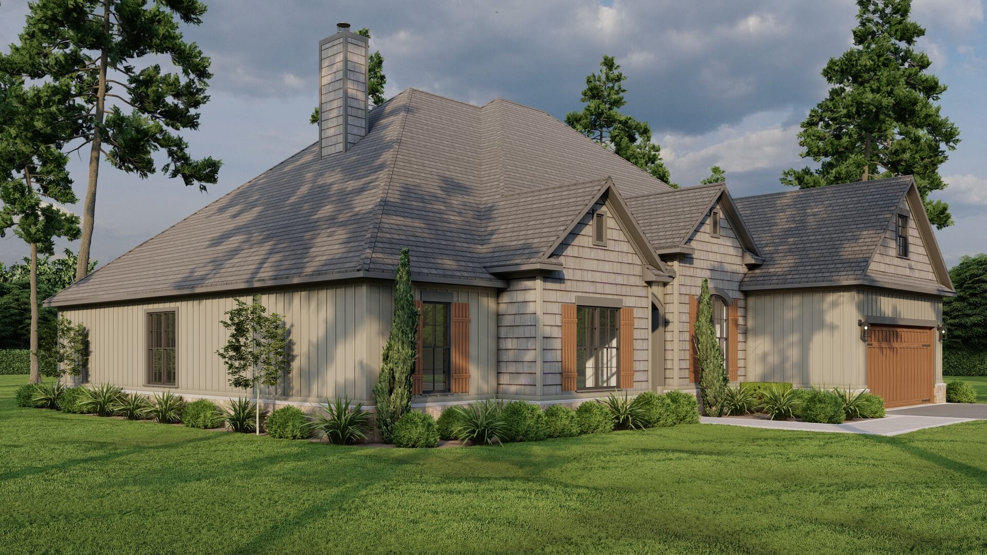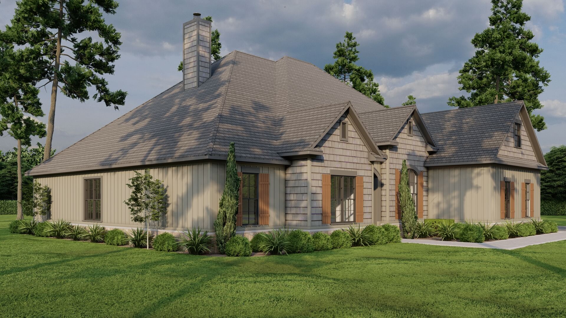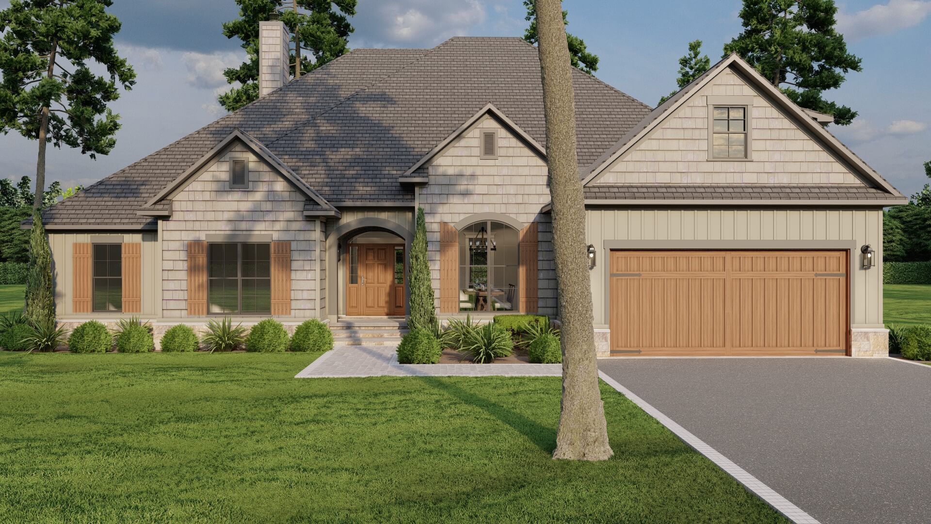 The exterior presents classic Craftsman features — shake and board & batten siding, charming shutters, and a side‑load garage that keeps curb appeal clean and uncluttered.