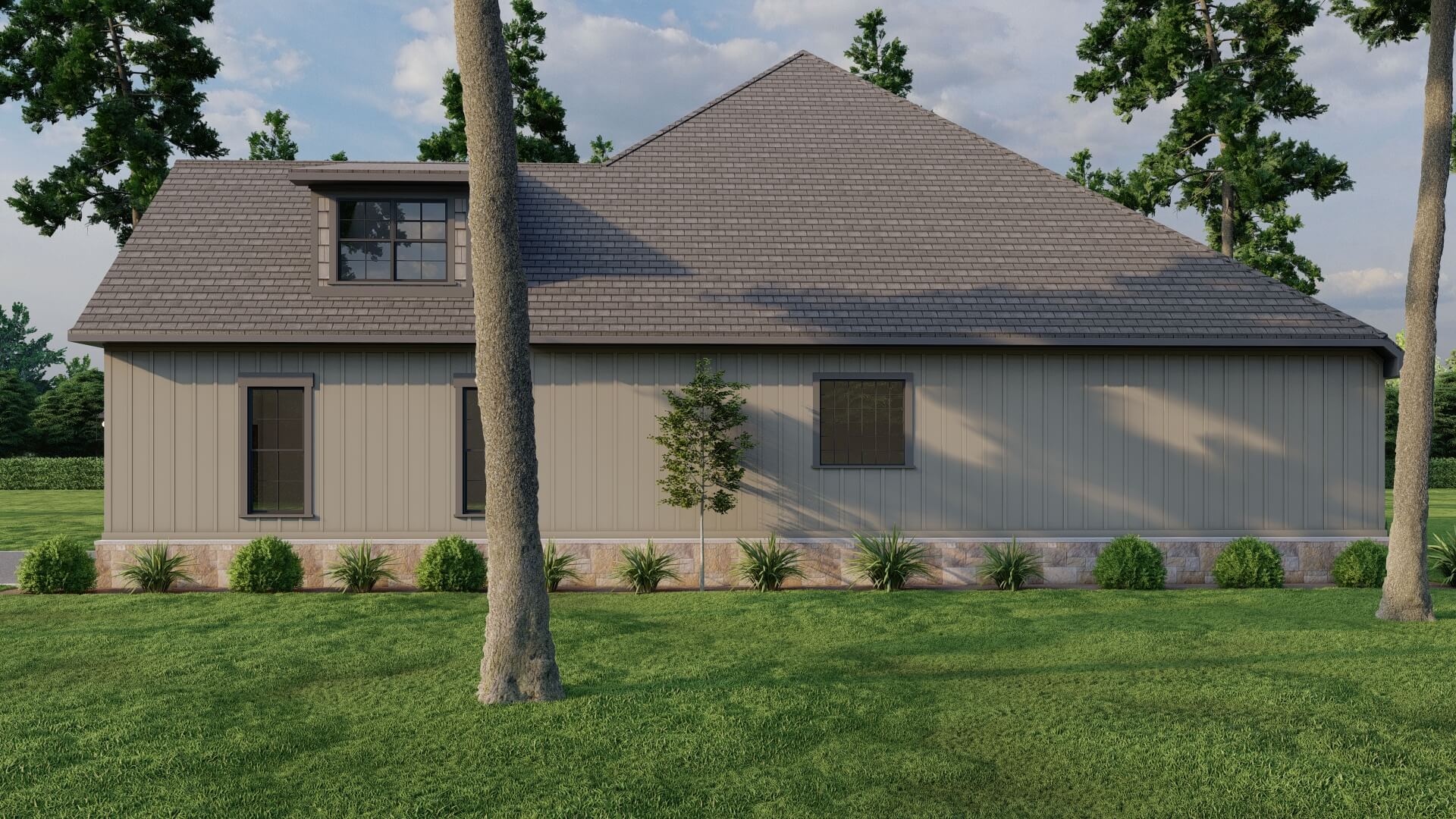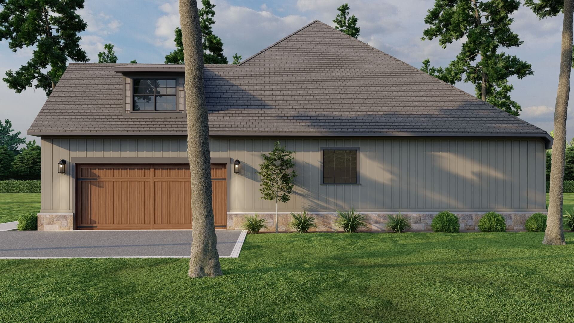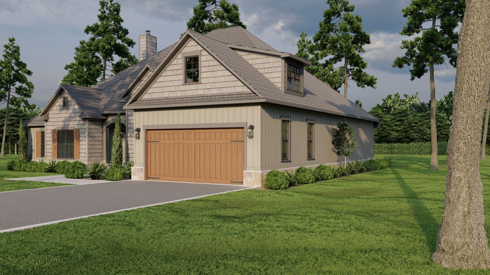 The exterior presents classic Craftsman features — shake and board & batten siding, charming shutters, and a side‑load garage that keeps curb appeal clean and uncluttered.