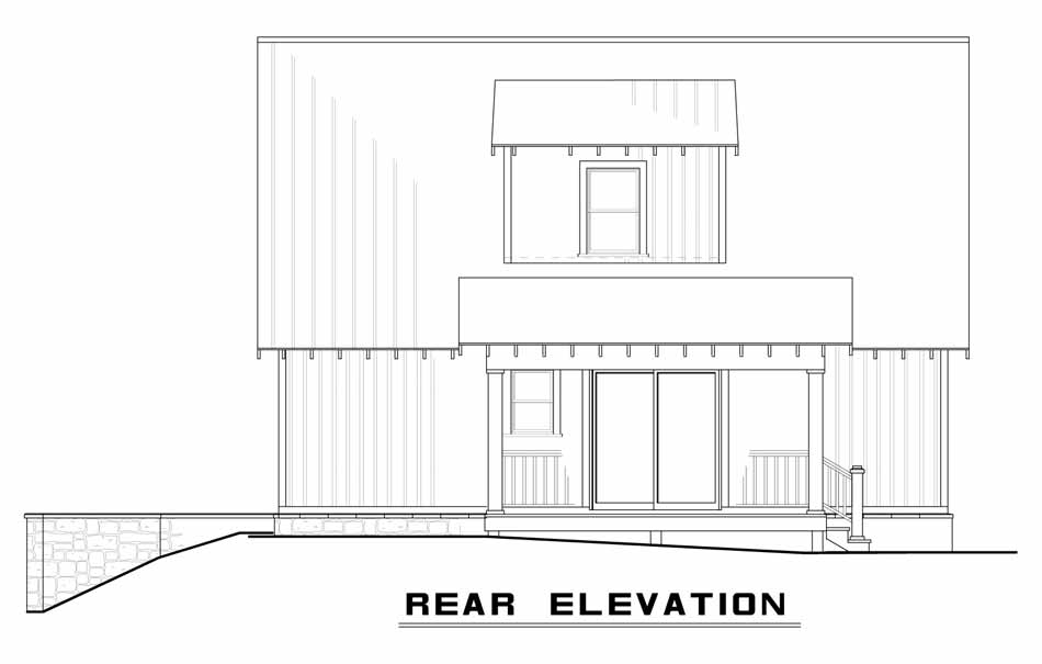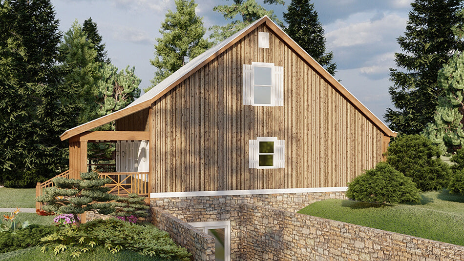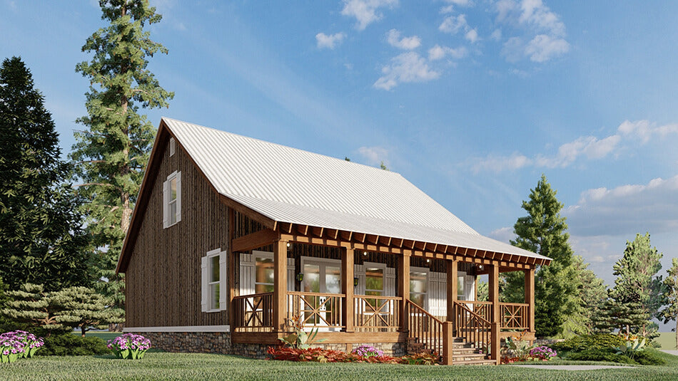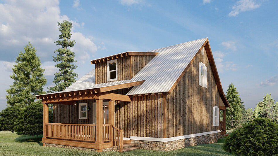 Aspen Falls includes metal roofing, a simple roofline, and exposed rafters on both covered porches, contributing to its rustic appeal.